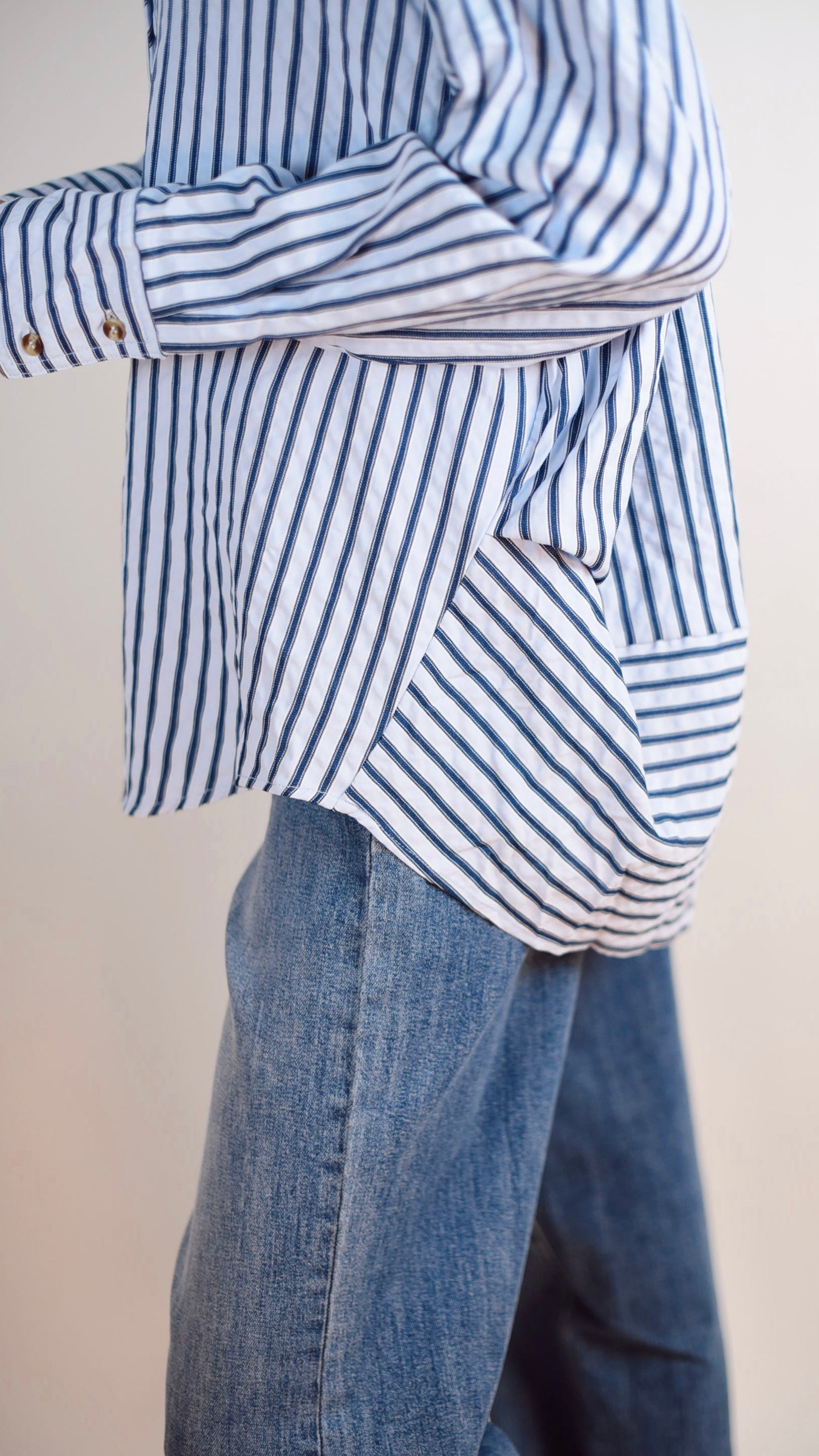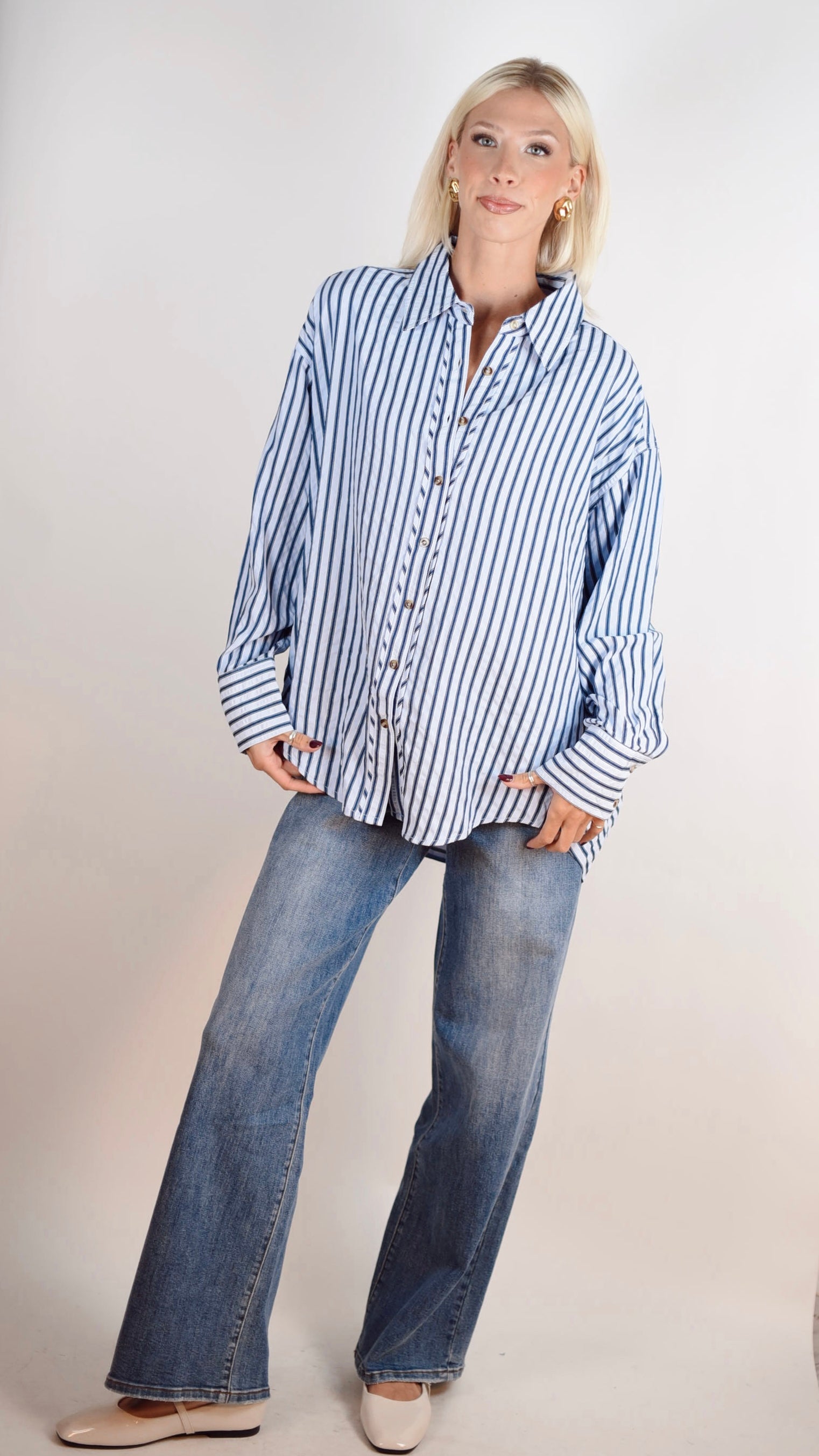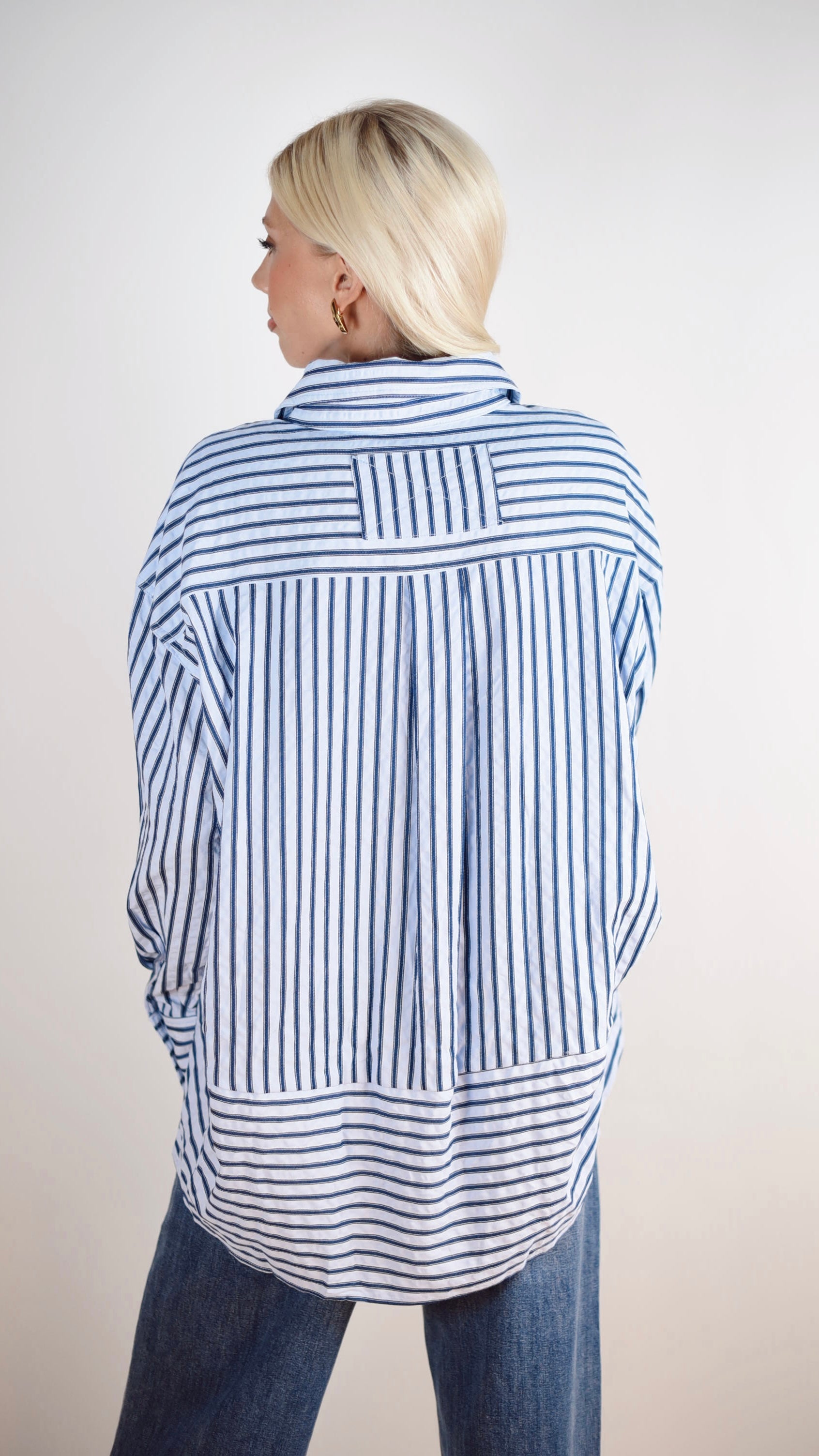 The Paisley Top is an oversized stripe blouse that features fun contrasting stripes along the sleeve cuffs and front button trim. This blouse includes light blue and navy stripes, and is an easy wardrobe staple - throw on with a pair of jeans for everyday wear, or layer with a dress pant and cardigan for those chilly days in the office.