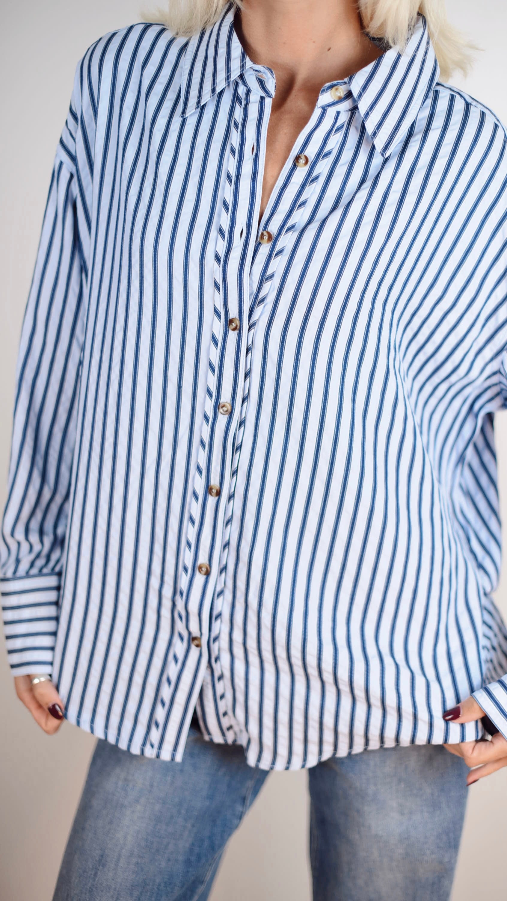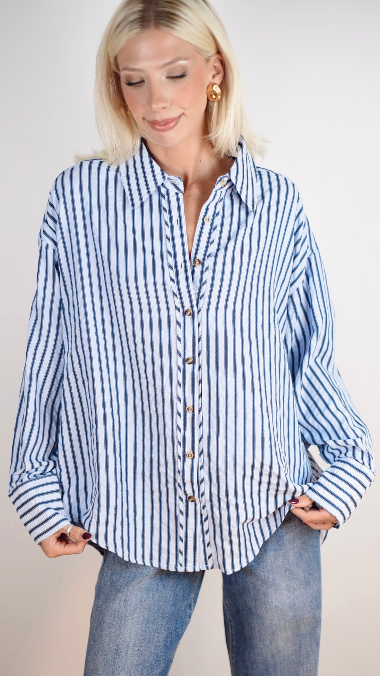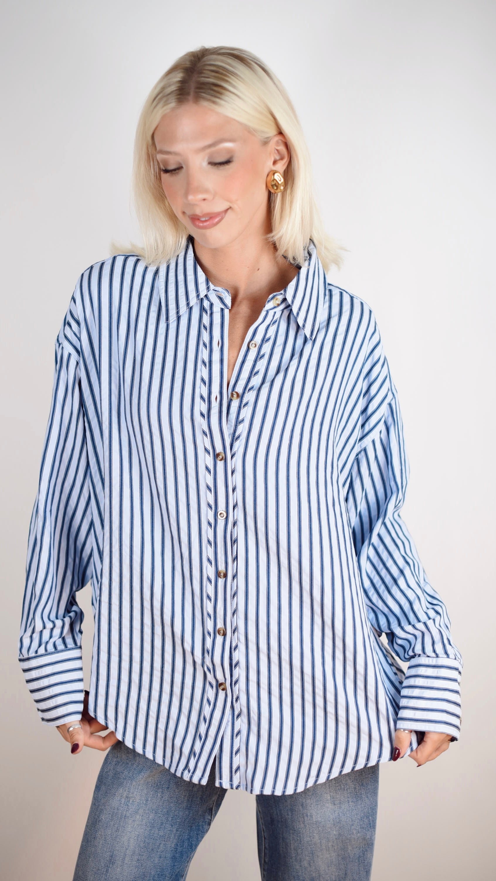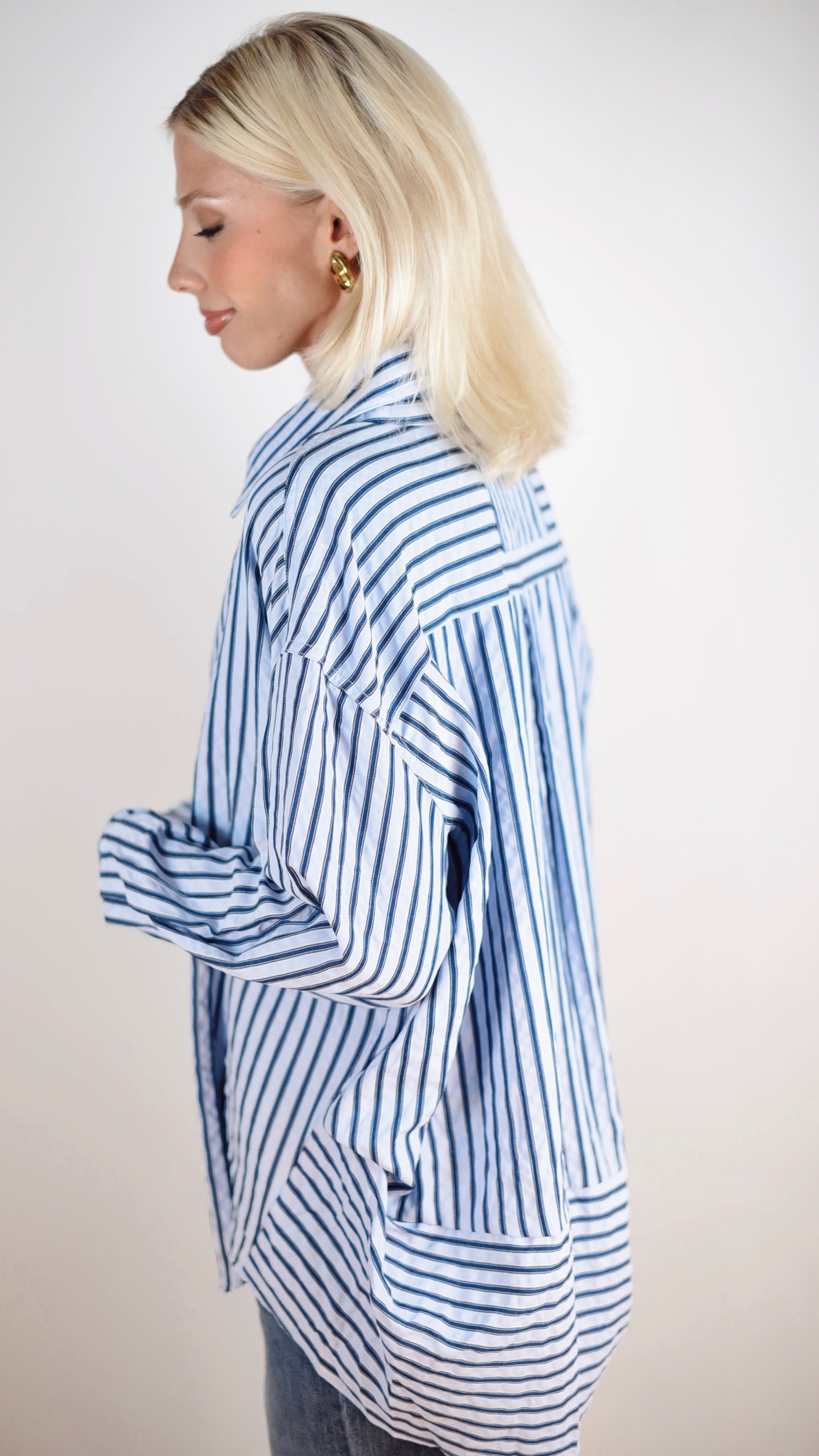 The Paisley Top is an oversized stripe blouse that features fun contrasting stripes along the sleeve cuffs and front button trim. This blouse includes light blue and navy stripes, and is an easy wardrobe staple - throw on with a pair of jeans for everyday wear, or layer with a dress pant and cardigan for those chilly days in the office.