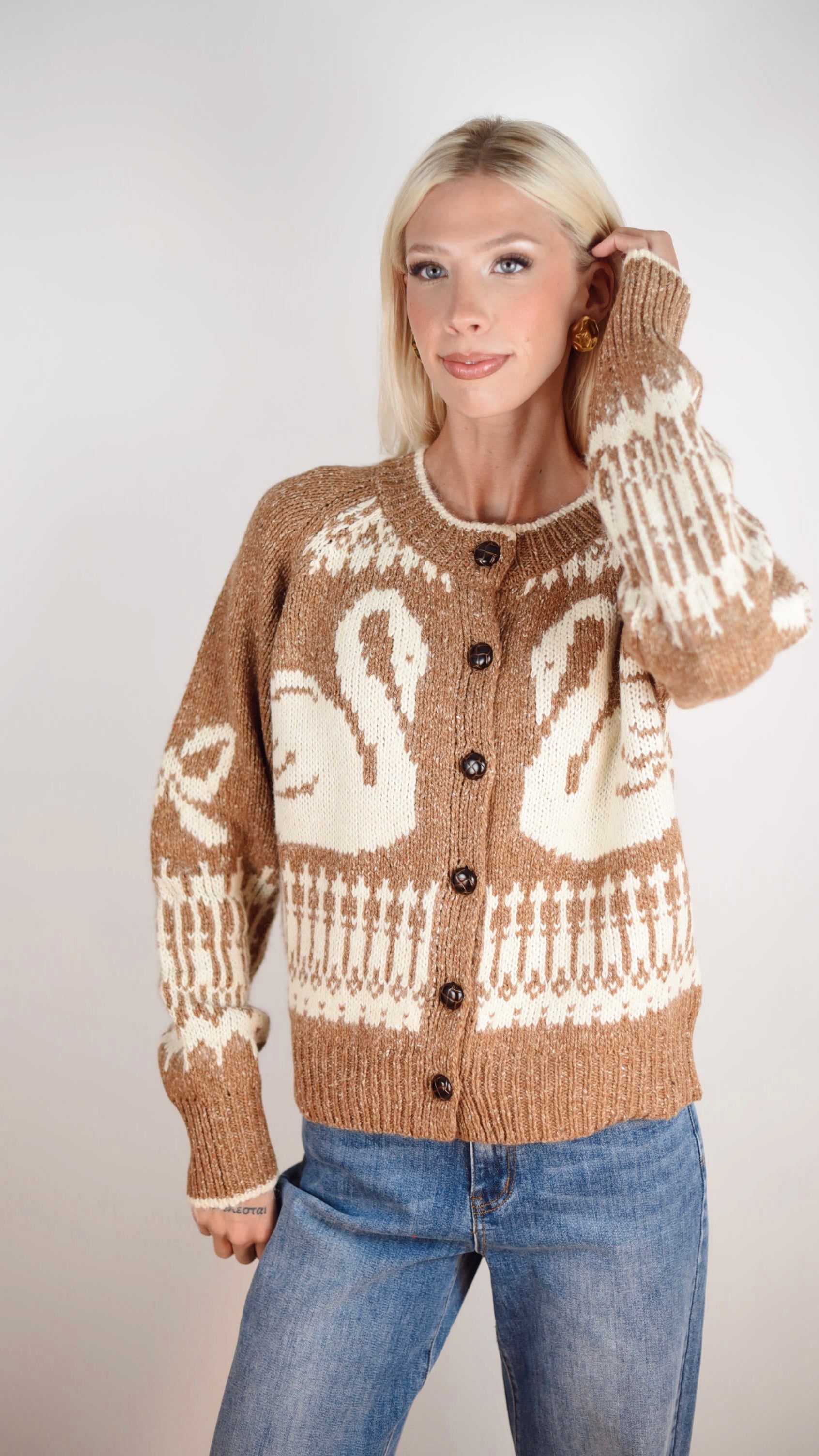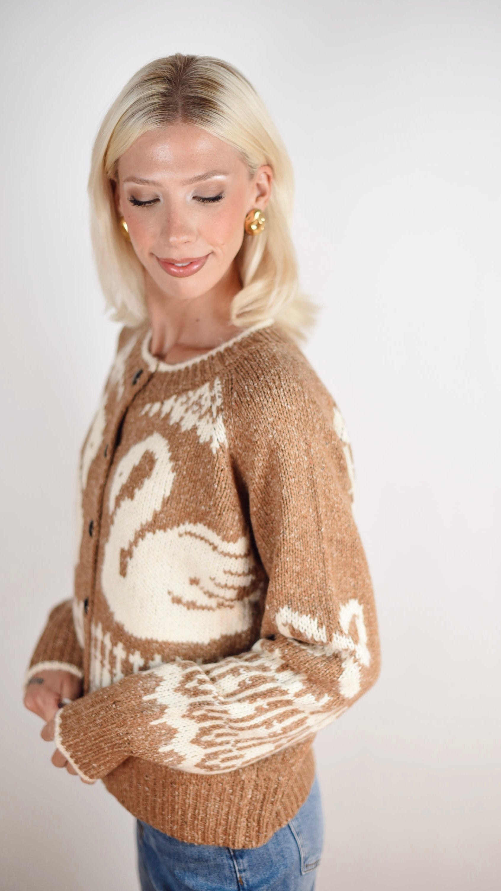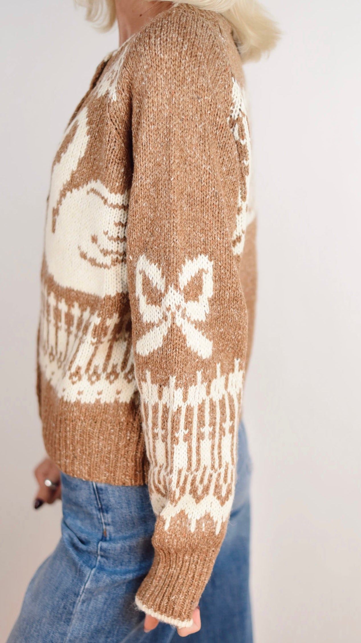 Stay cozy this fall with the Audrey Sweater. This sweater features a rich camel brown color with the sweetest ivory swan pattern. Along the sleeve, you’ll notice a subtle bow pattern to add in an extra girly detail.