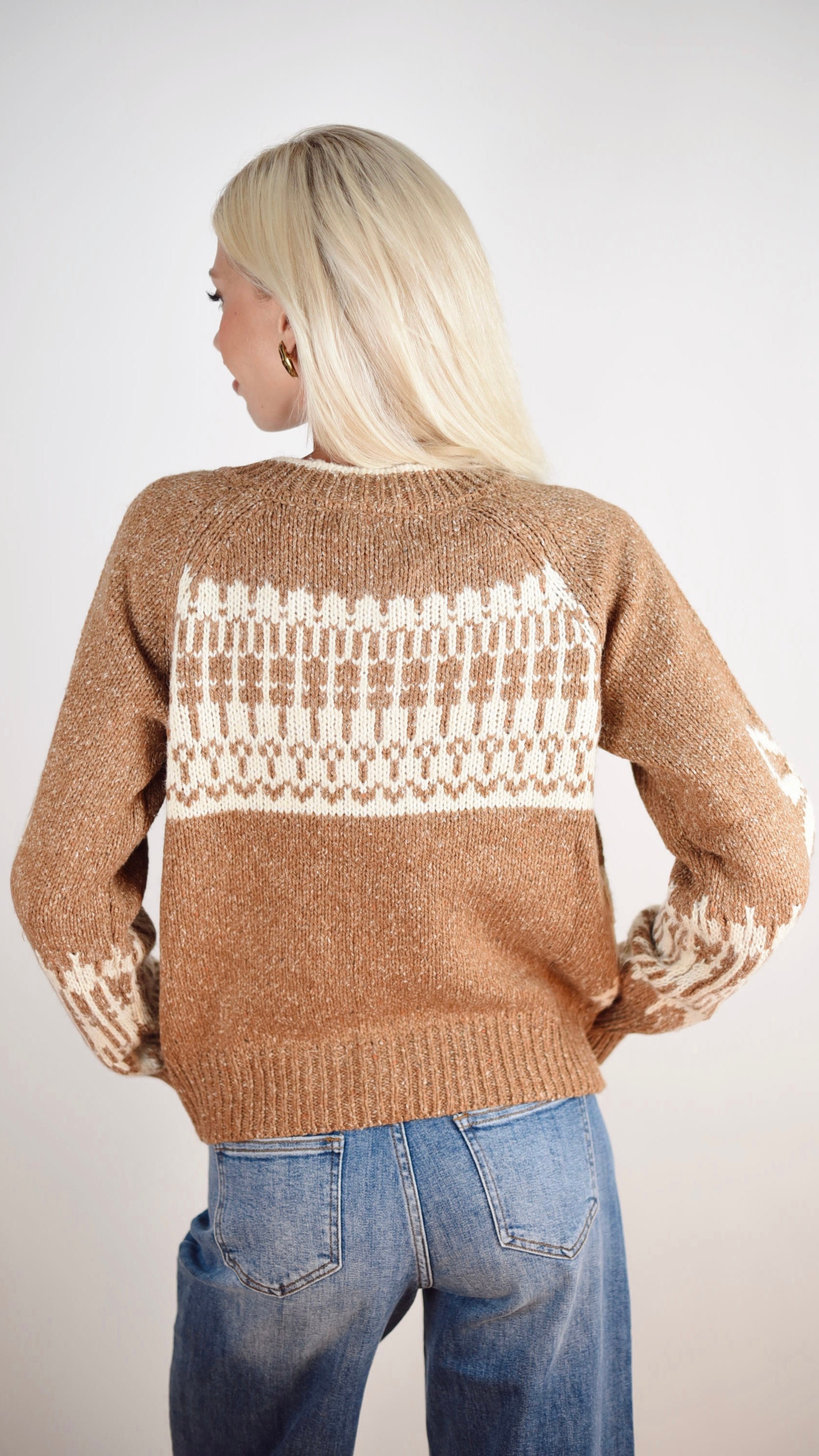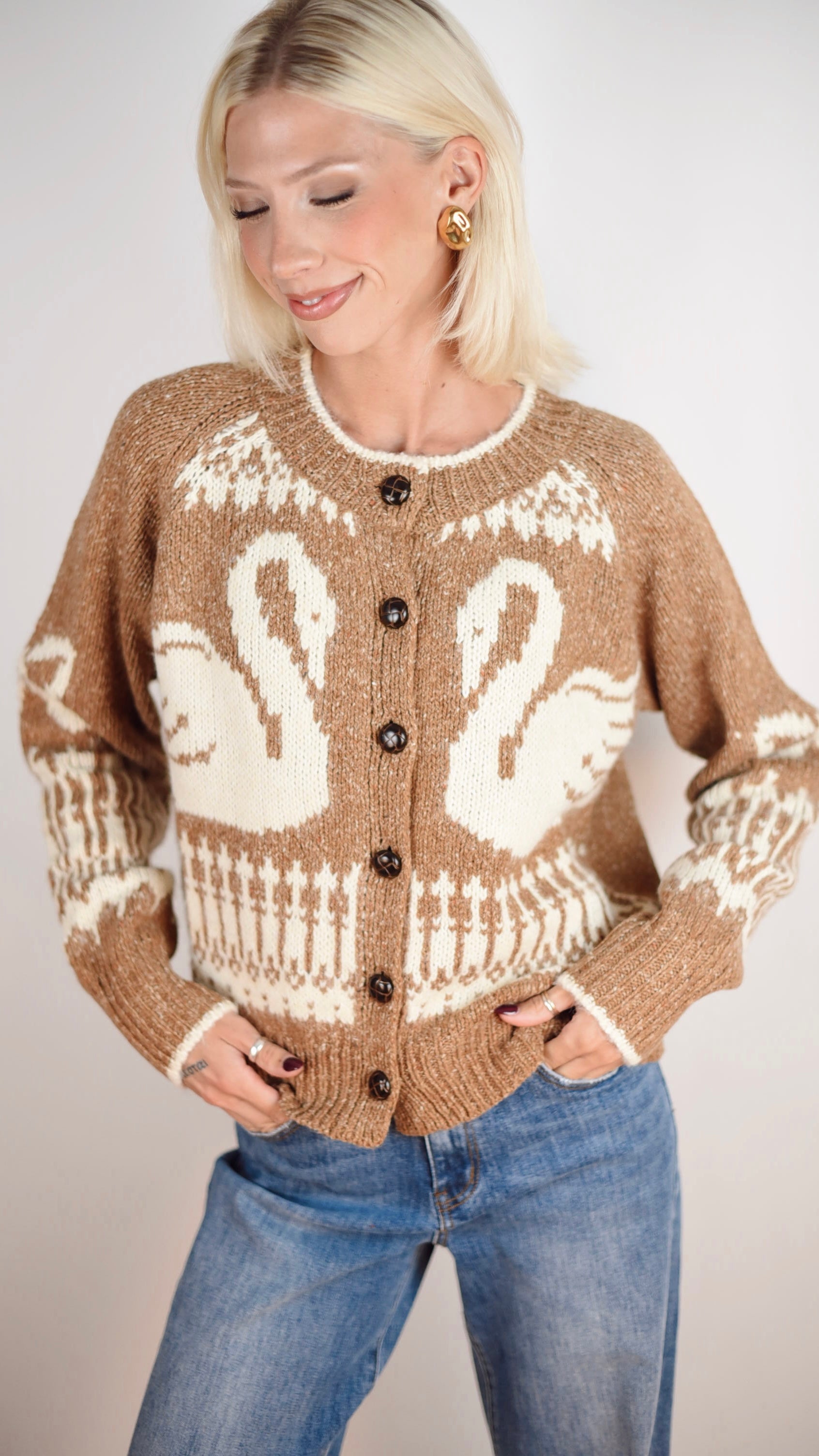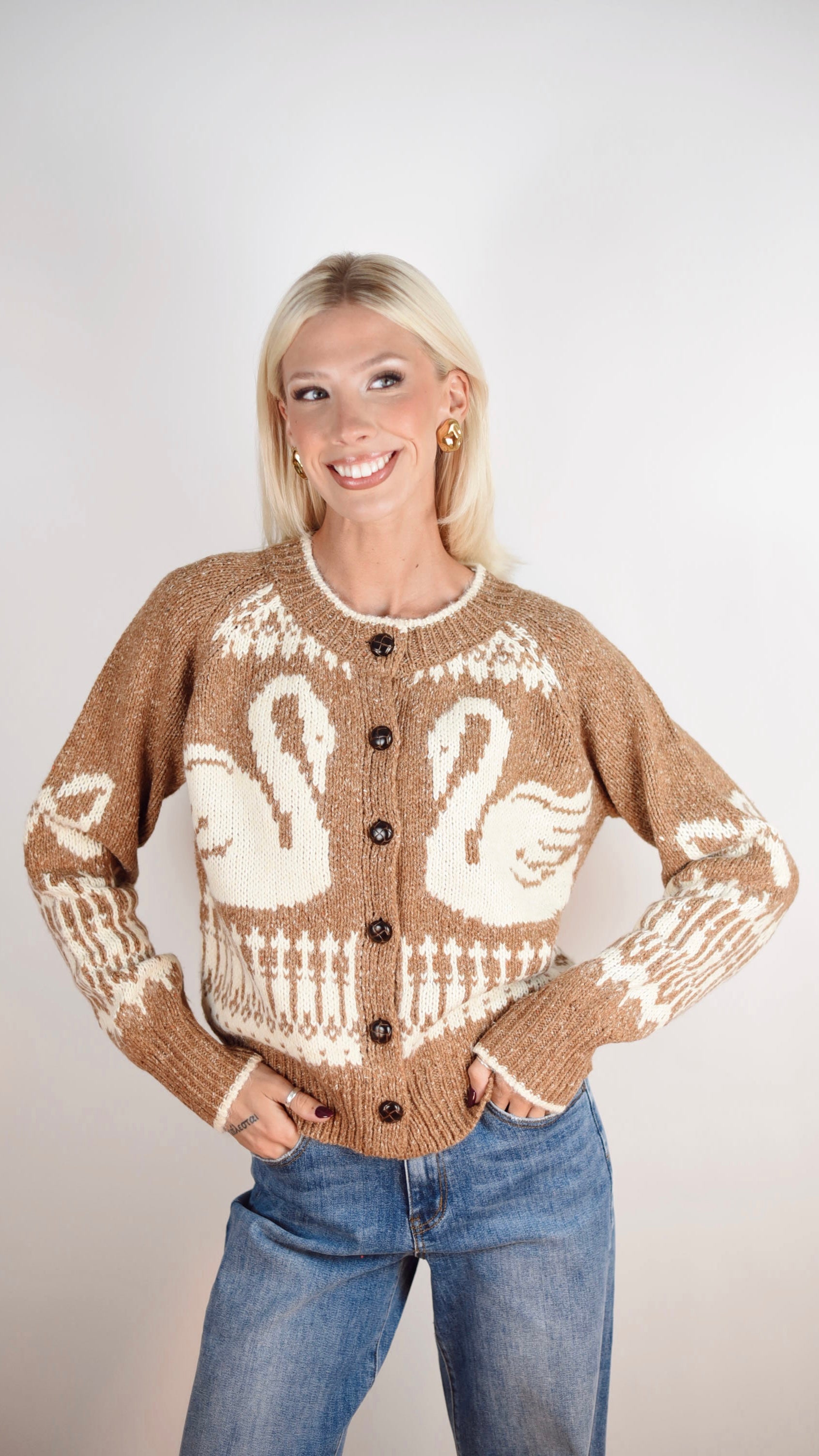 Stay cozy this fall with the Audrey Sweater. This sweater features a rich camel brown color with the sweetest ivory swan pattern. Along the sleeve, you’ll notice a subtle bow pattern to add in an extra girly detail.