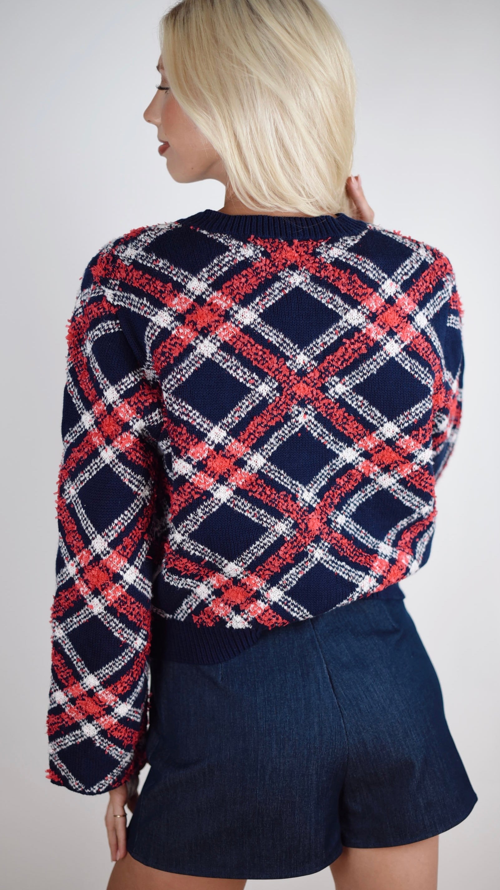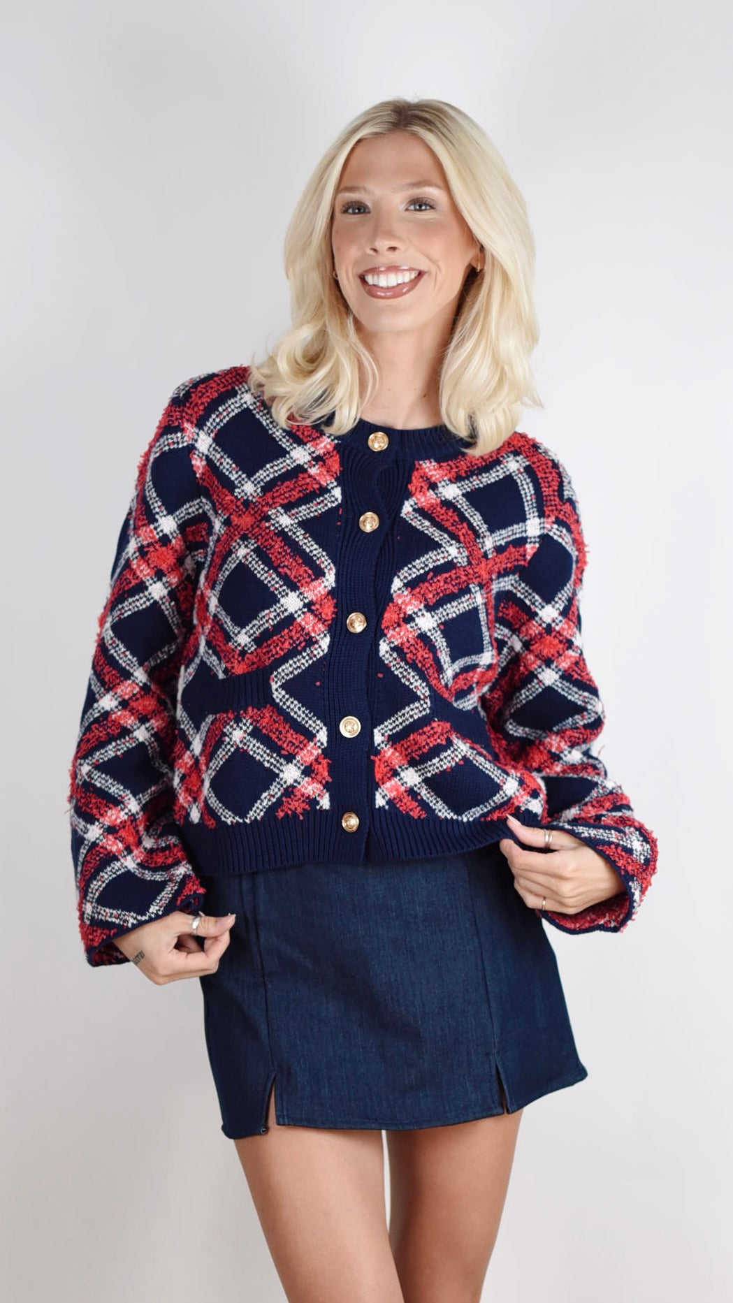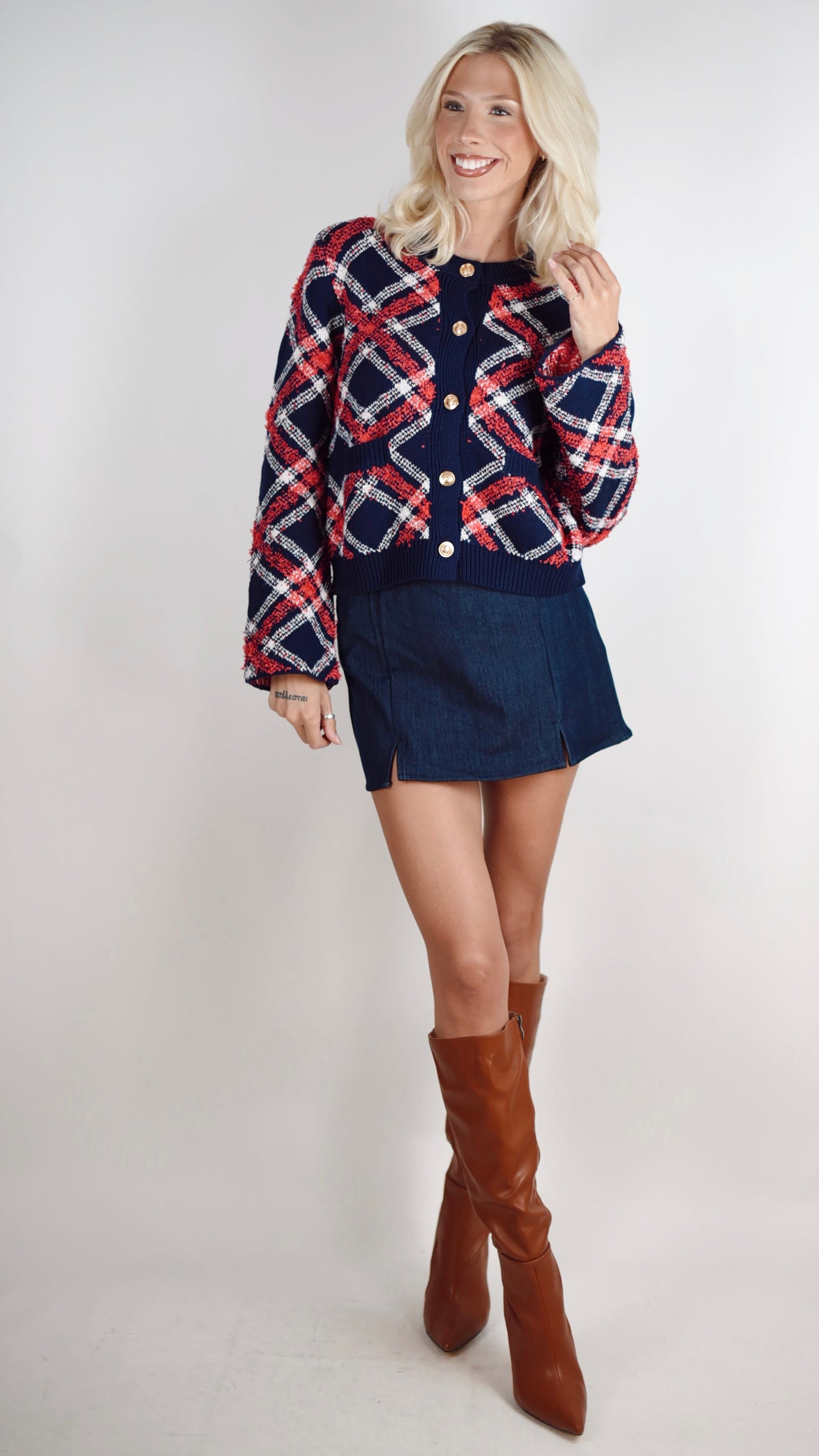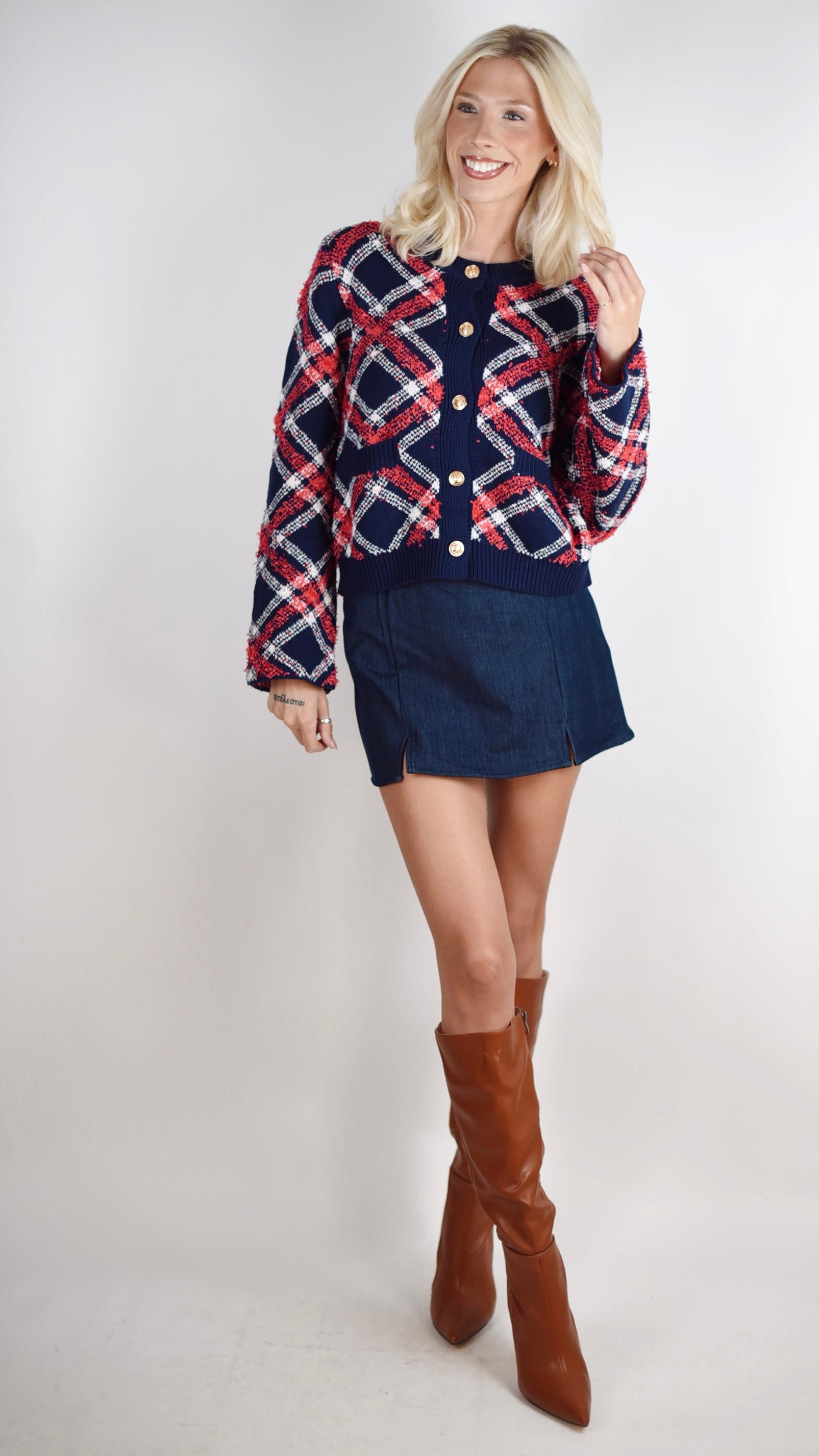 The Aria Dress features the sweetest navy, red and ivory plaid pattern with gold accent buttons. This sweater can easily be styled as-is with a skirt or pair of jeans, or can be worn as a layering element for transitional pieces.
