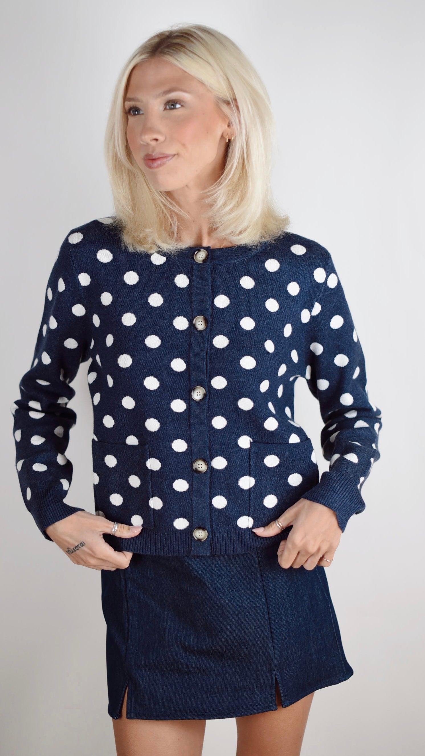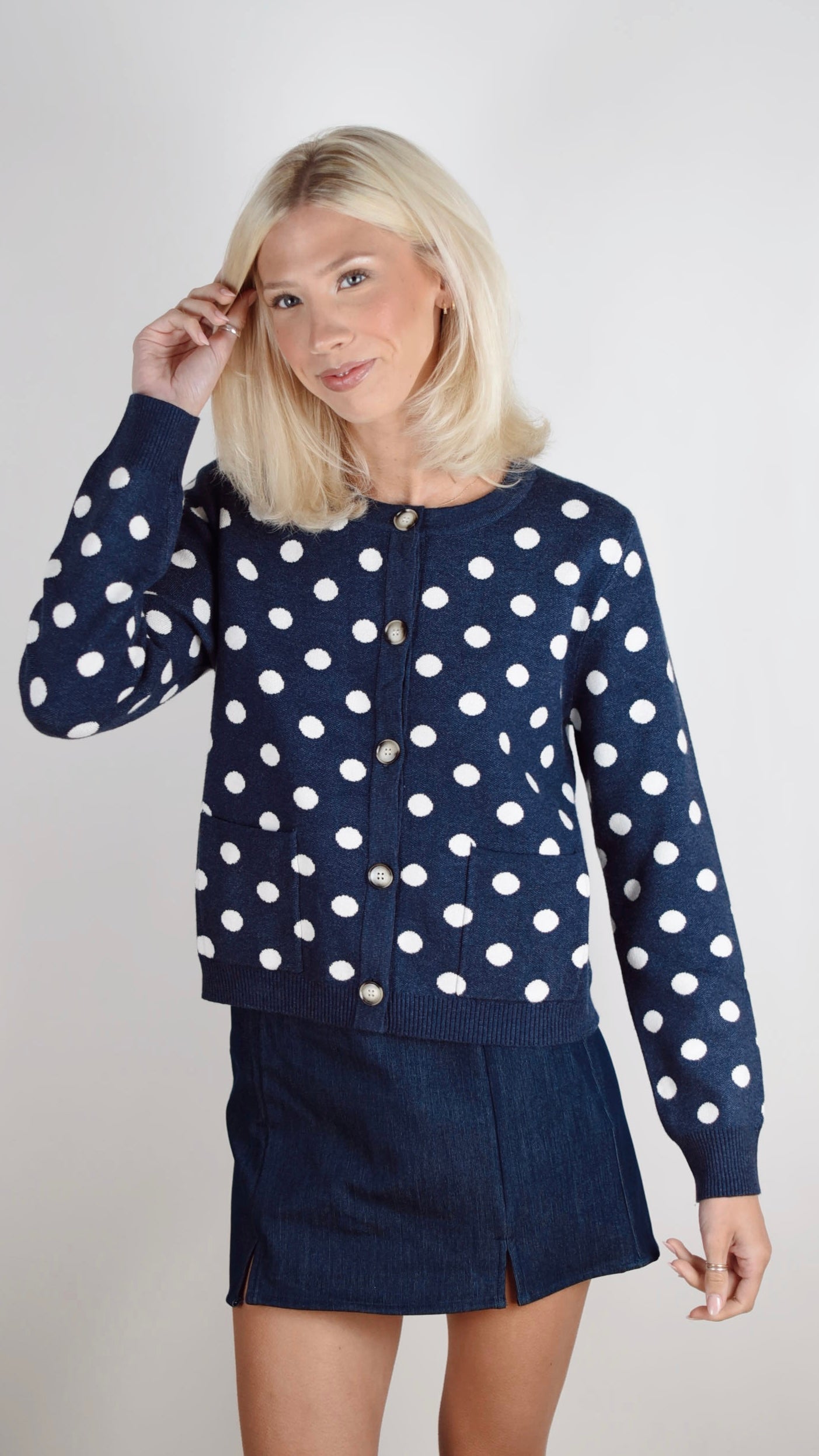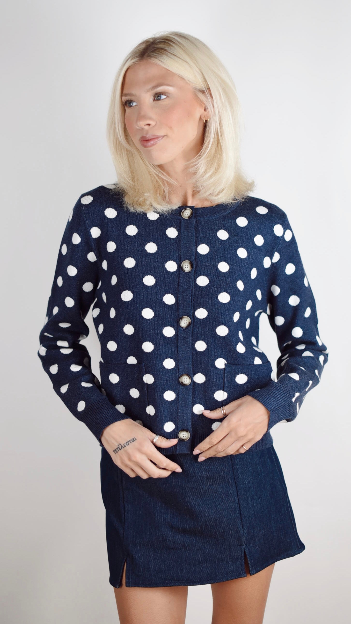 The Candis Sweater is an ultra-soft button up that brings a fun polka dot element into your fall collection. This piece features subtle tortoise patterned buttons, and two front pockets.