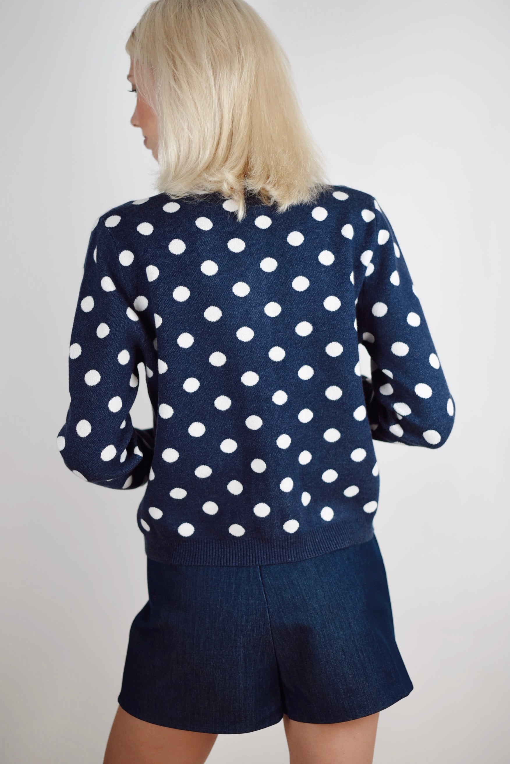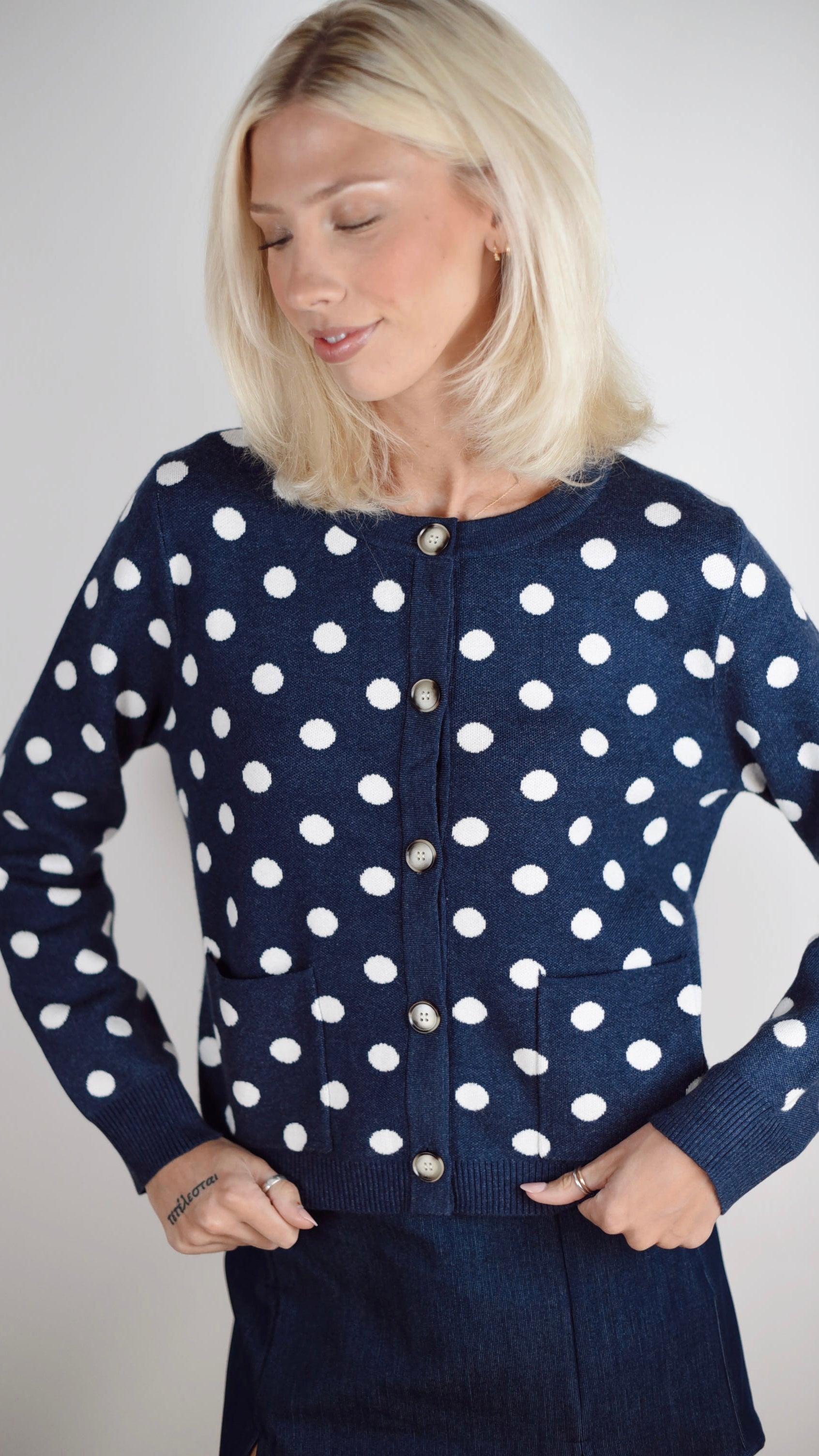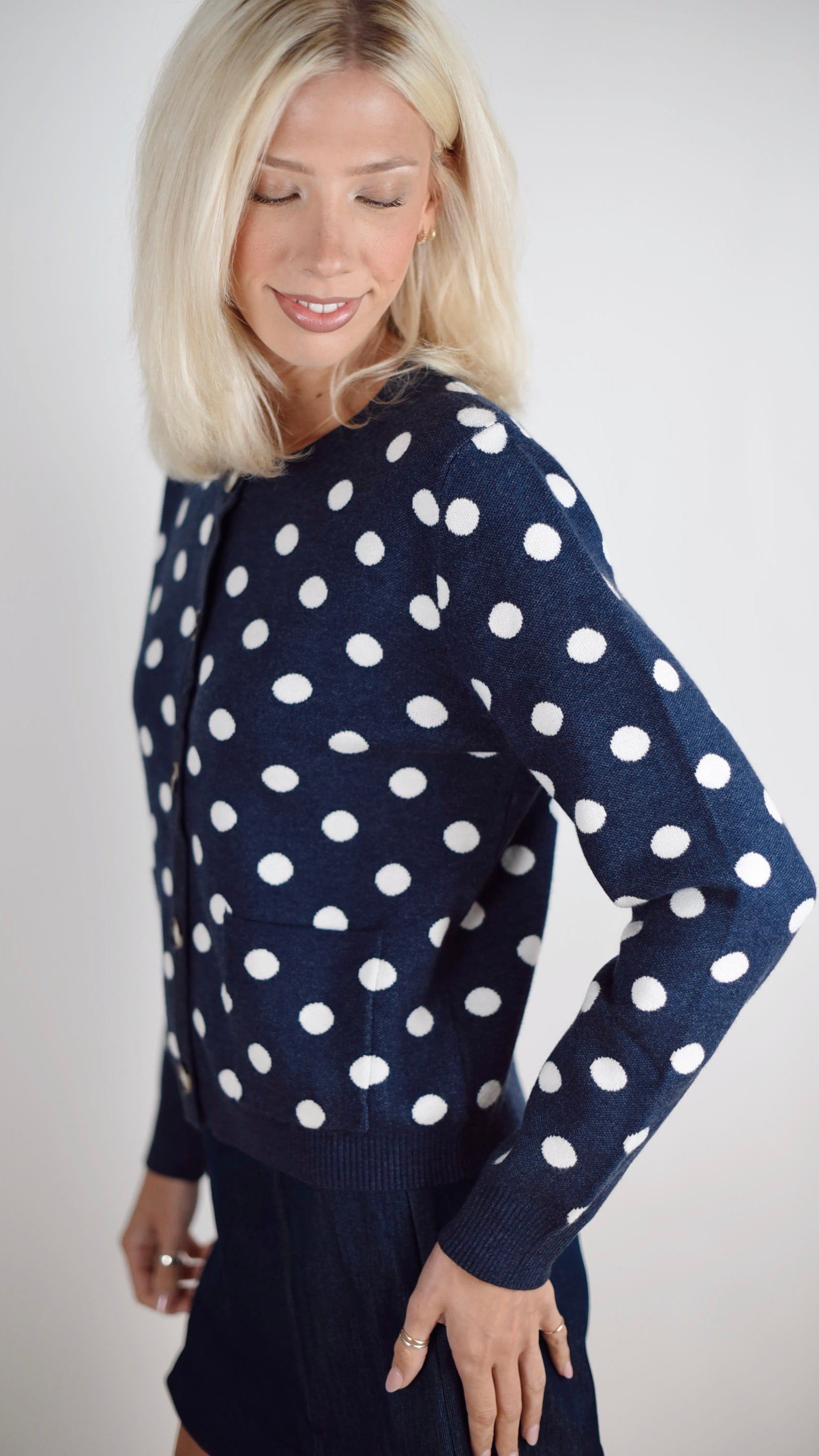 The Candis Sweater is an ultra-soft button up that brings a fun polka dot element into your fall collection. This piece features subtle tortoise patterned buttons, and two front pockets.