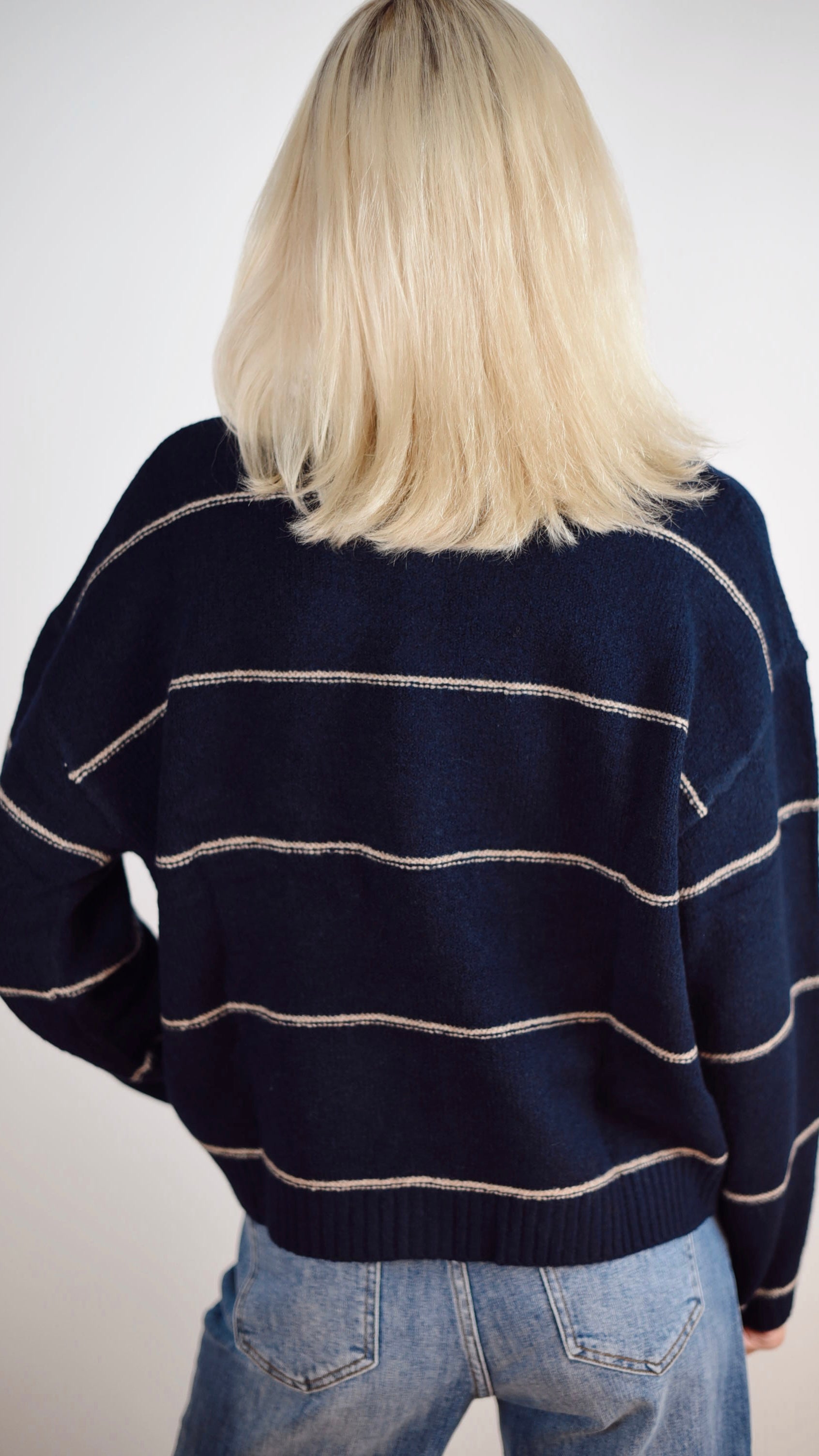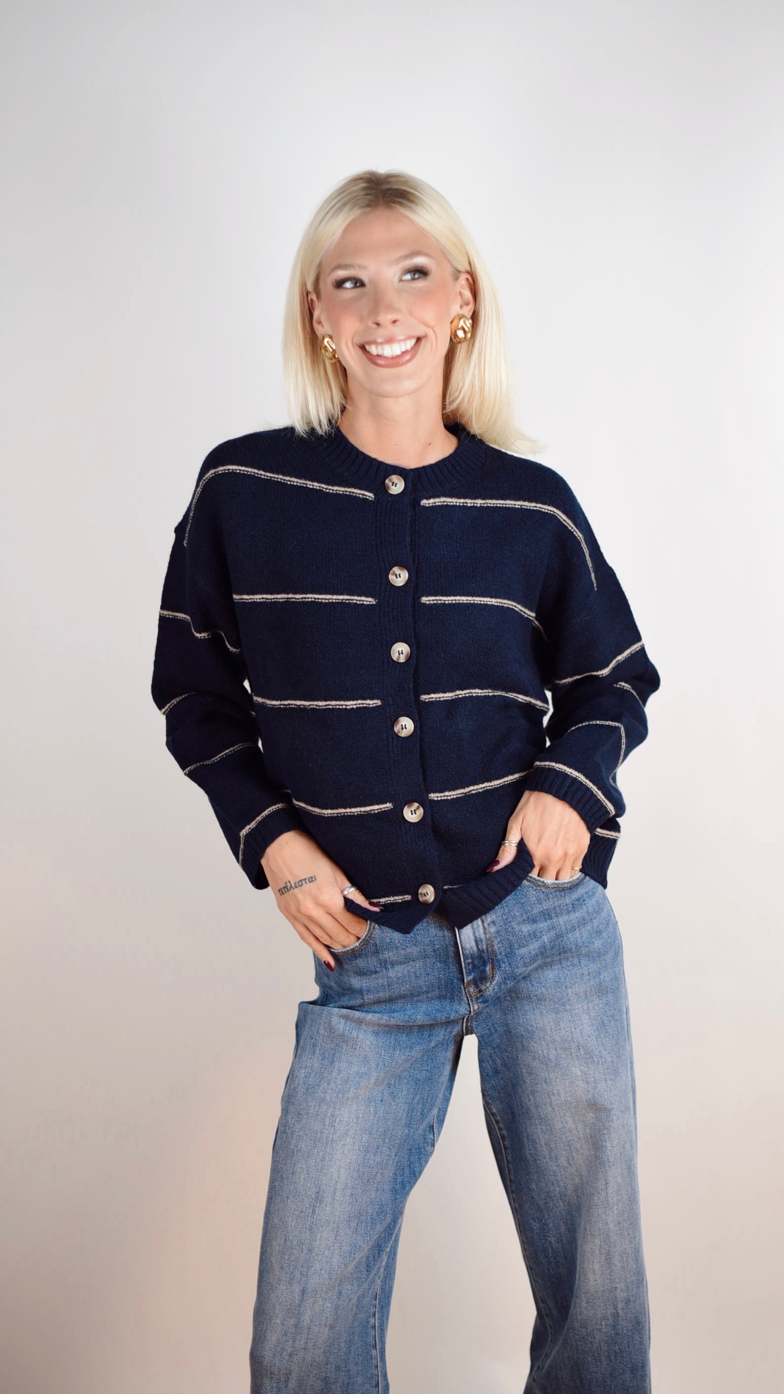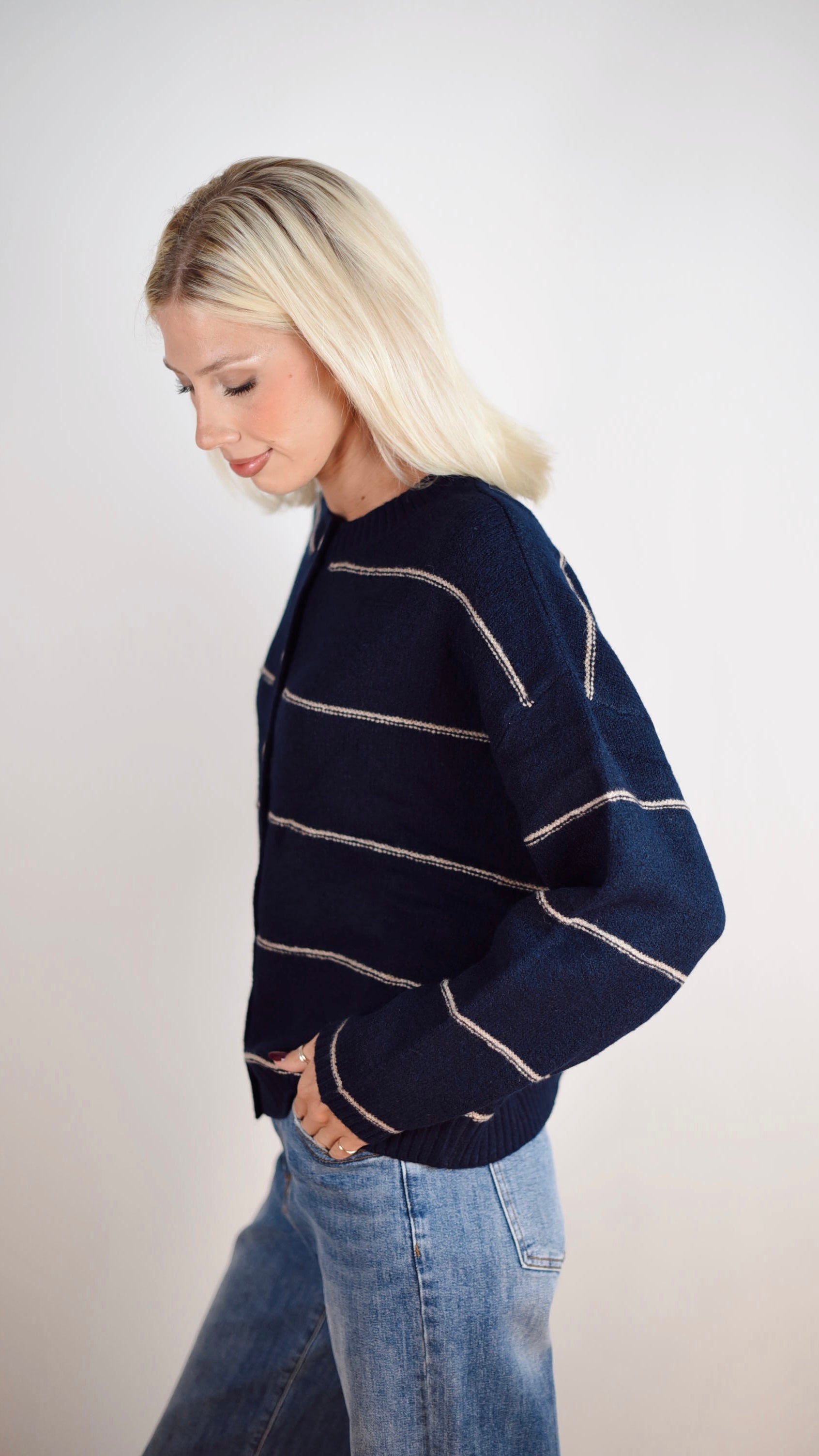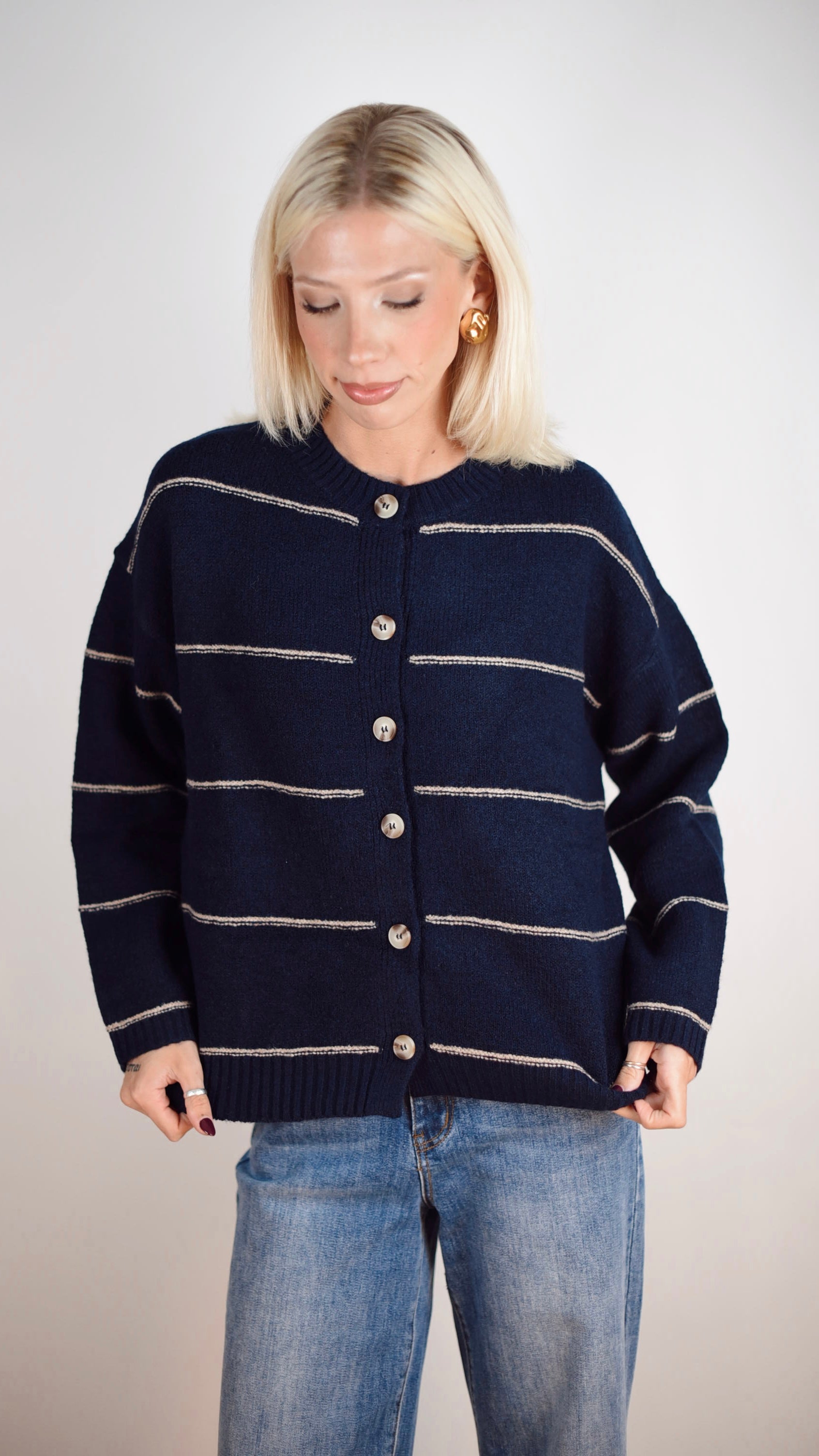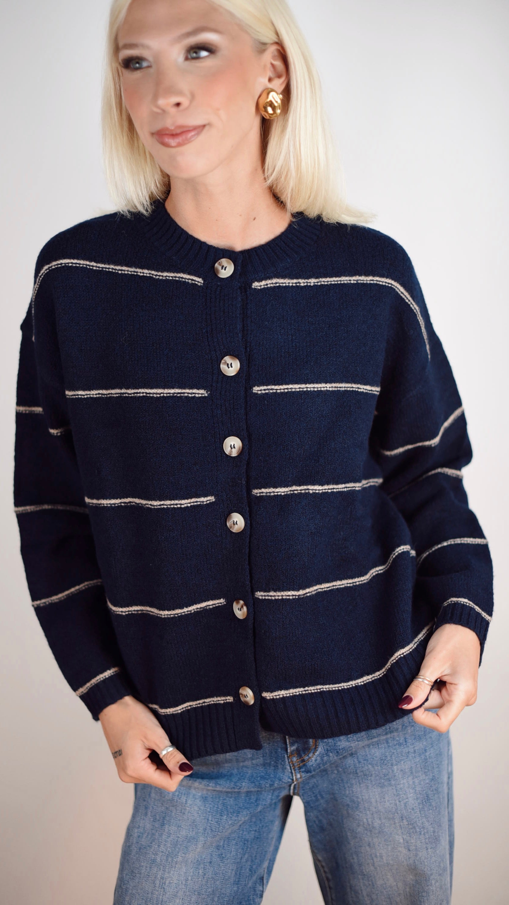 The Natalie Sweater features a sweet ivory stripe pattern and tortoise patterned full front buttons to bring subtle girly touches to your fall wardrobe. This piece fits on the looser side, making it extra cozy and easy to layer with.