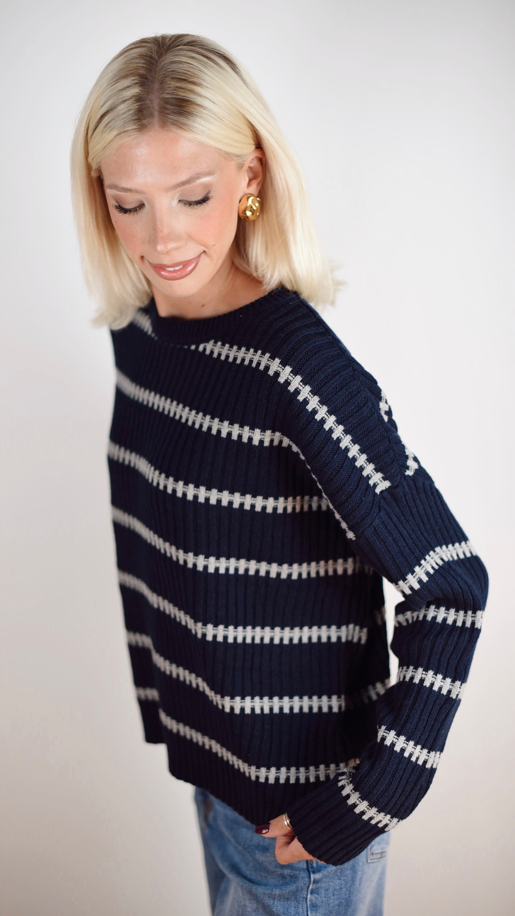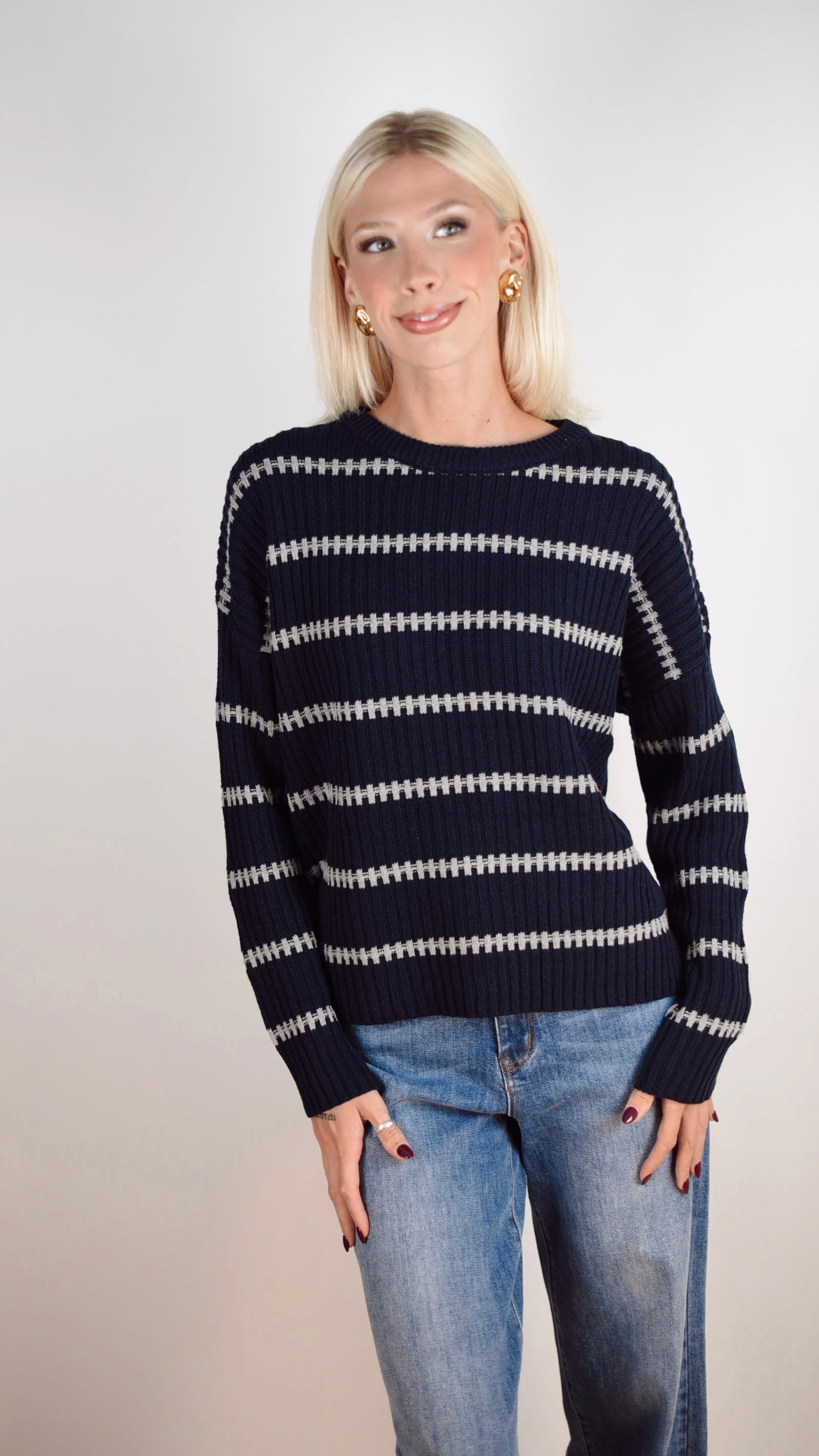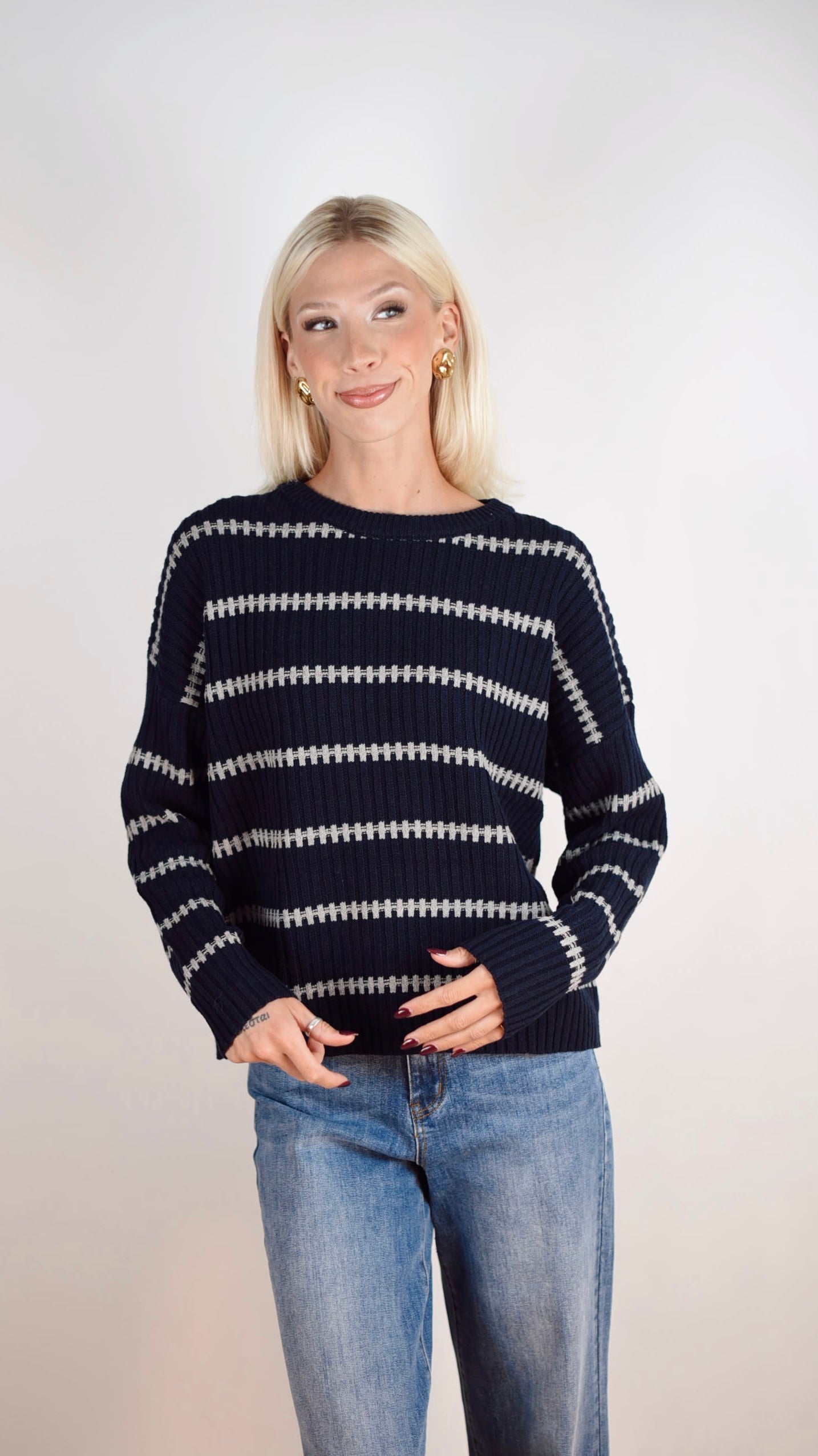 The Maria Sweater is sure to keep you nice and comfy as the weather gets cooler. This sweater features a unique gray stripe pattern with a navy base. The slight oversized fit makes this a perfect sweater to toss on with a pair of leggings for a chill day, but can easily be dressed up with a dress pant or skirt for any occasion.