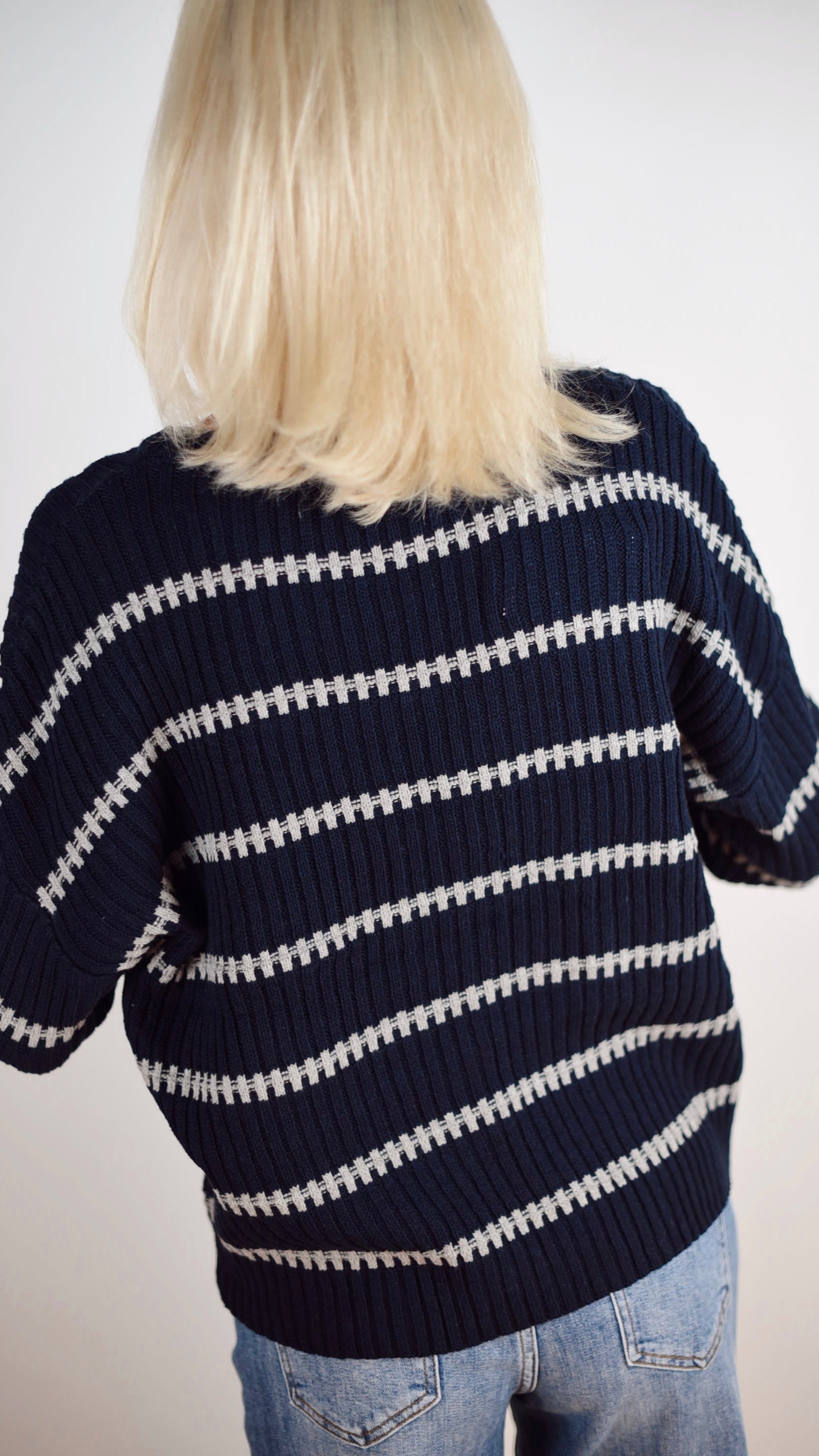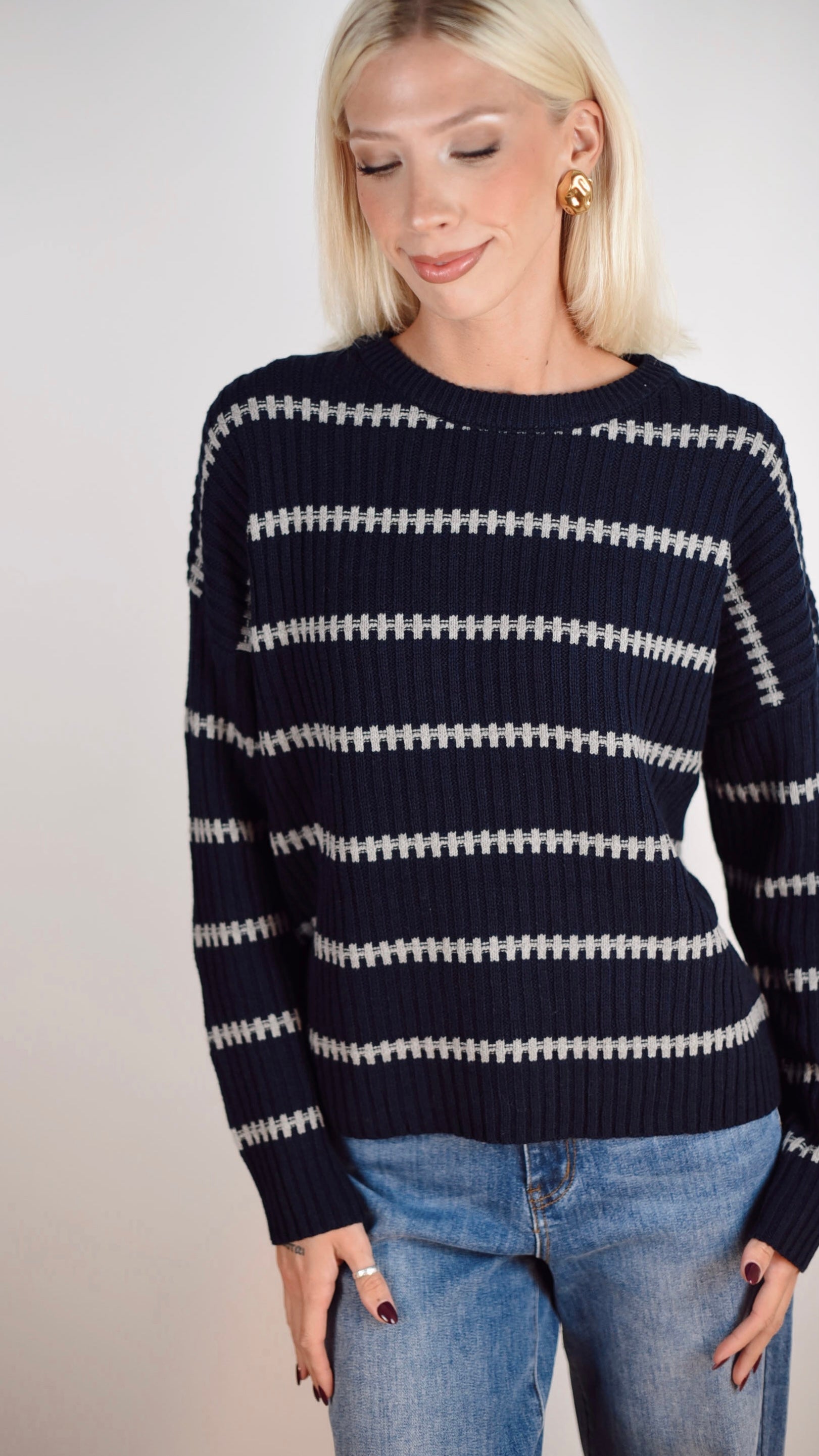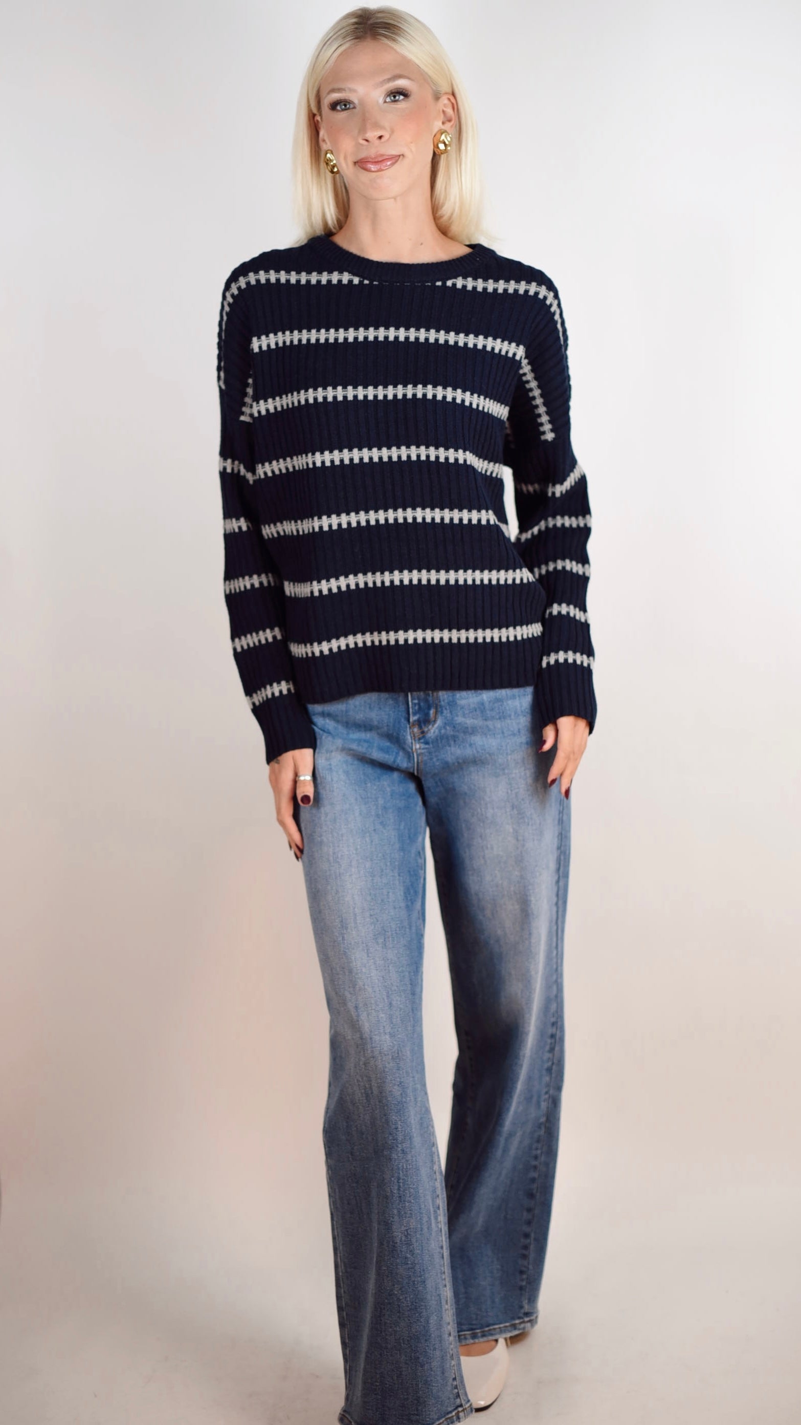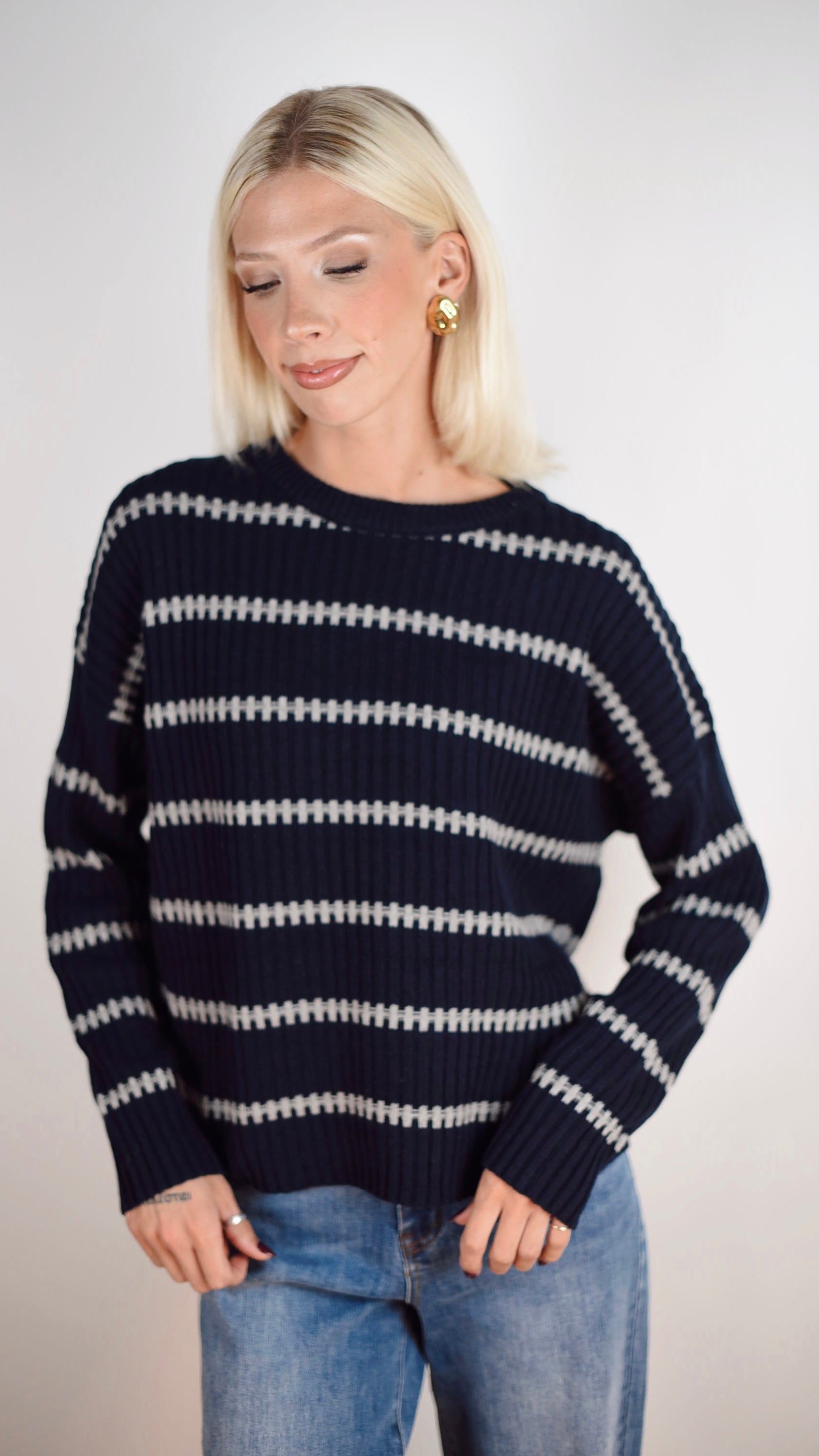 The Maria Sweater is sure to keep you nice and comfy as the weather gets cooler. This sweater features a unique gray stripe pattern with a navy base. The slight oversized fit makes this a perfect sweater to toss on with a pair of leggings for a chill day, but can easily be dressed up with a dress pant or skirt for any occasion.