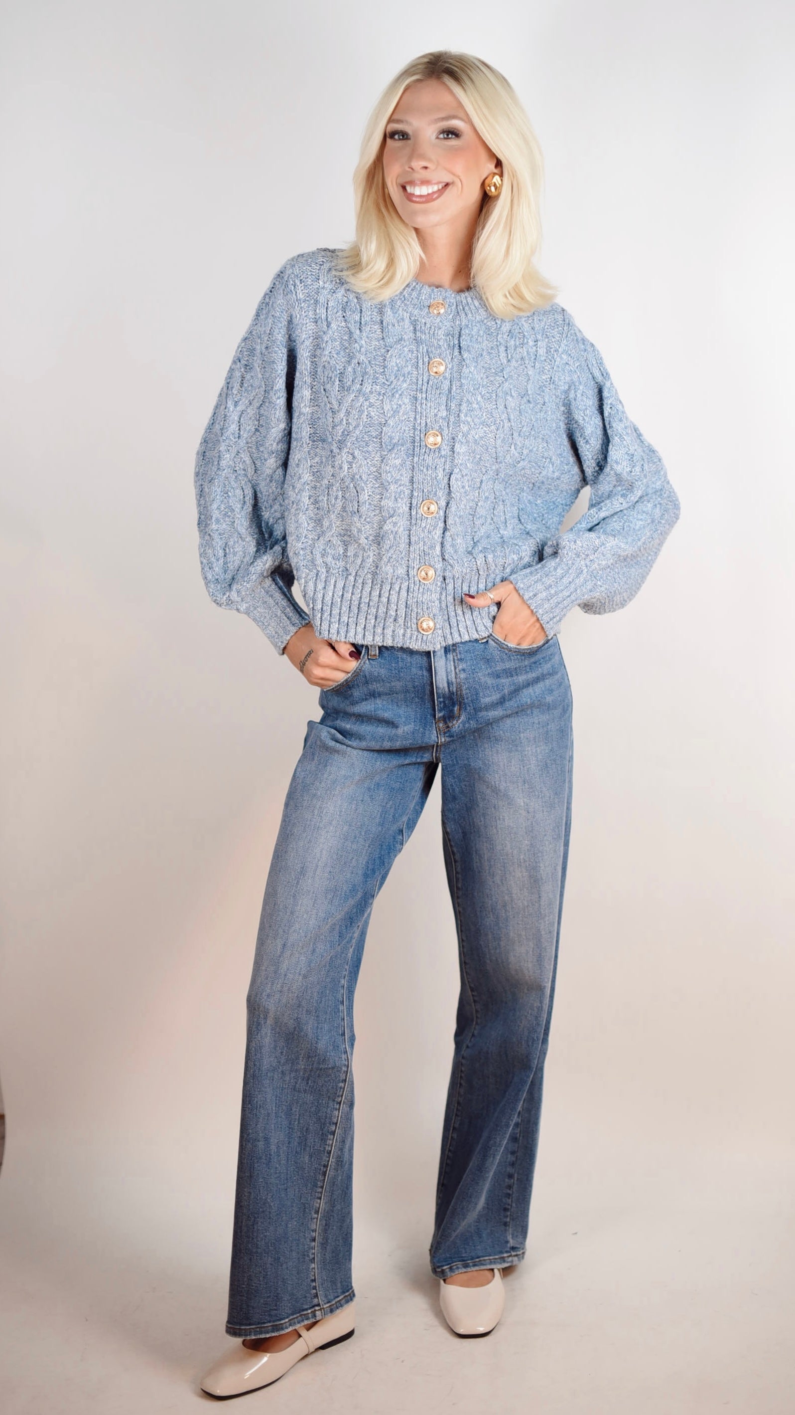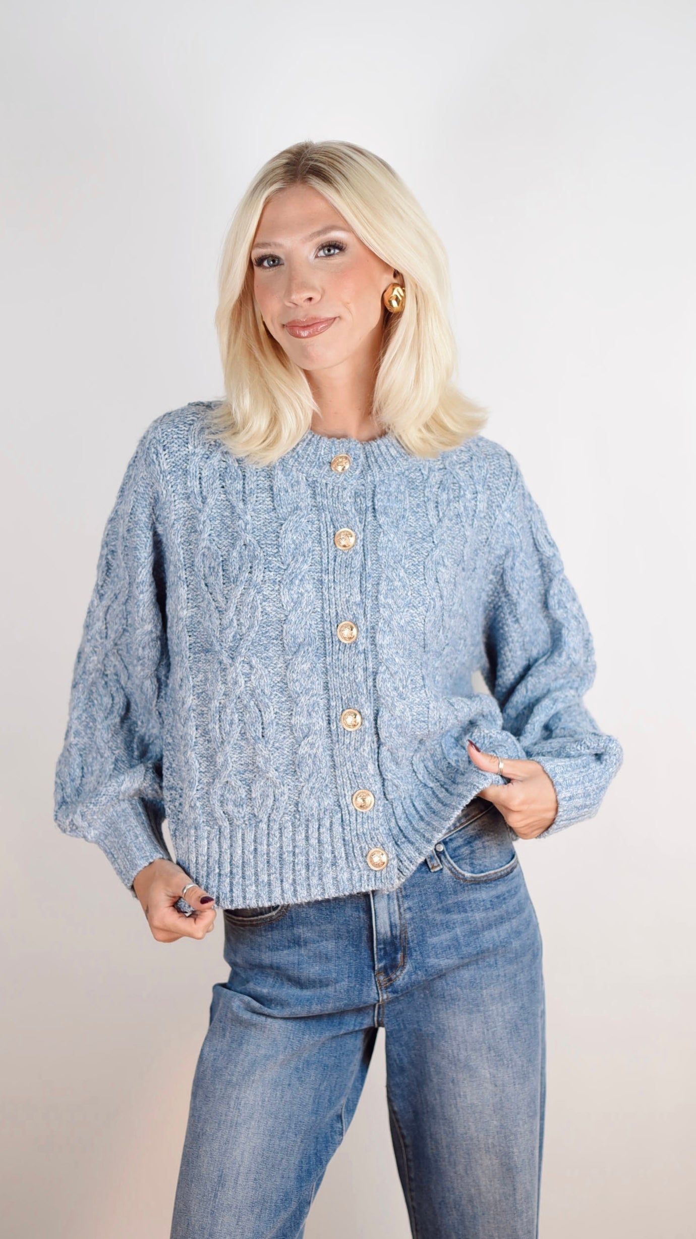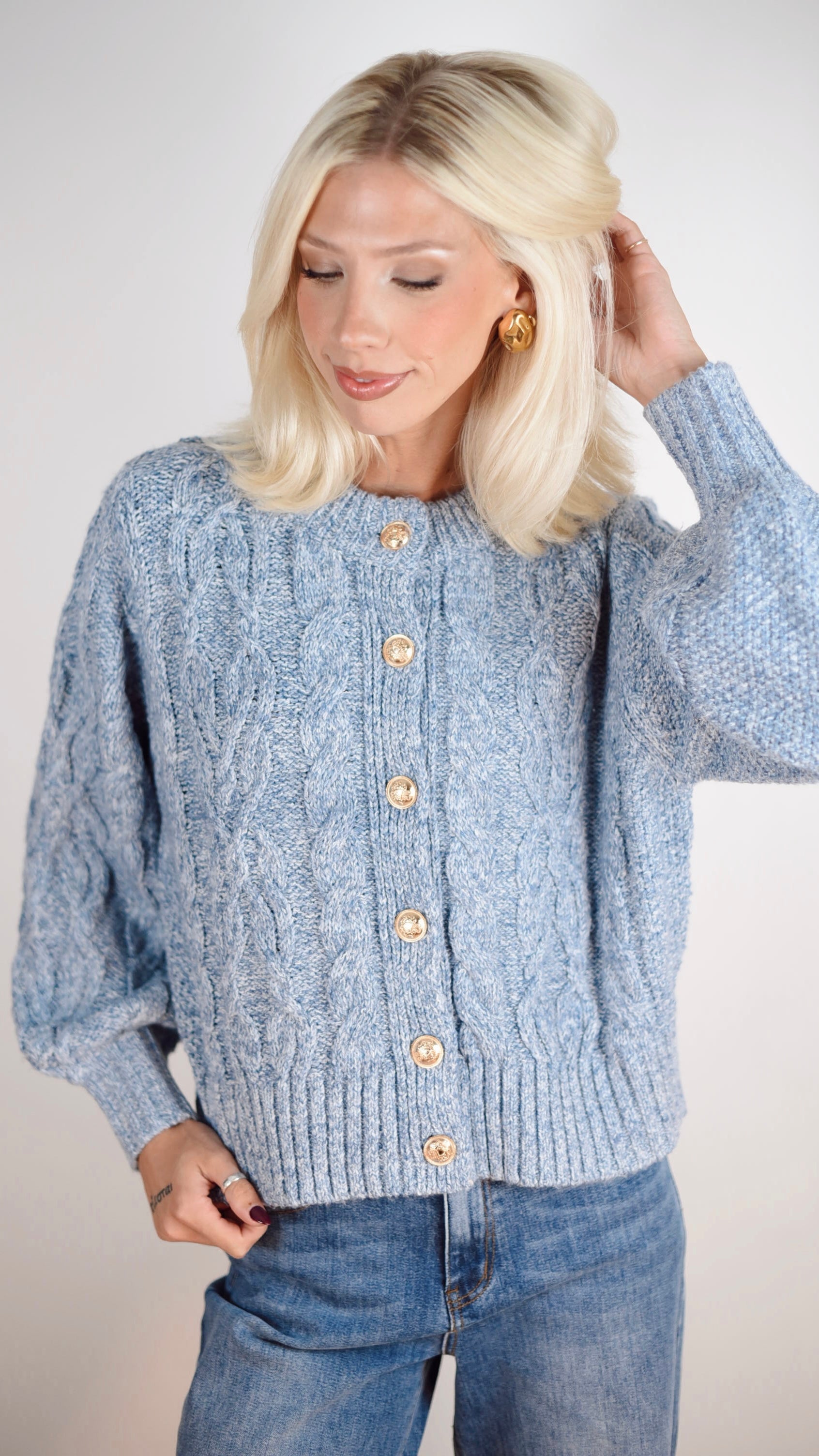 The Sabrina Sweater is a must for this upcoming fall and winter season. The chunky cable-knit is heavy enough to wear alone, or unbutton and throw over a basic as a layering element. The soft gray-blue of this sweater brings a subtle pop of color into your outfit, while allowing the gold buttons to stand out.