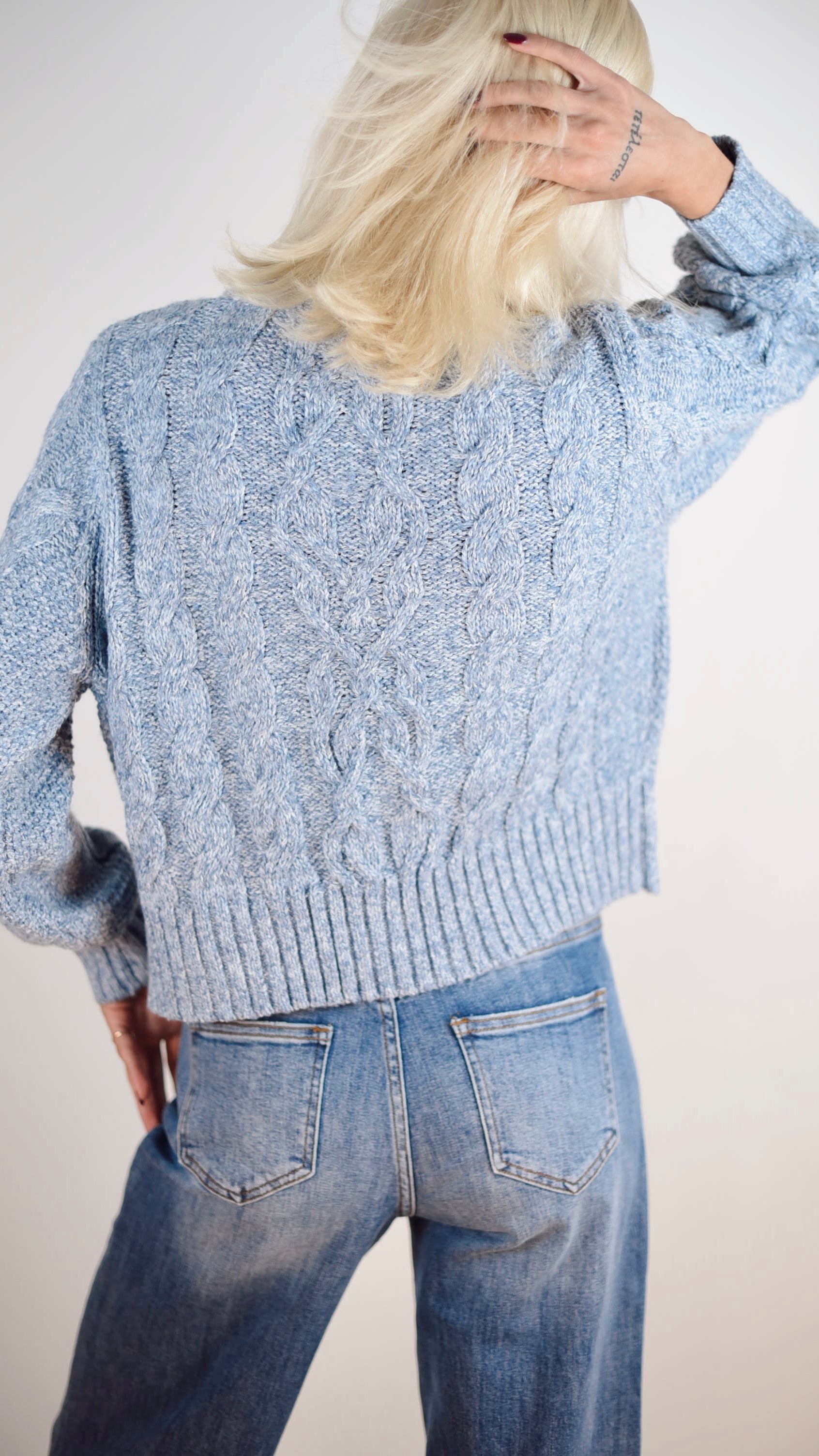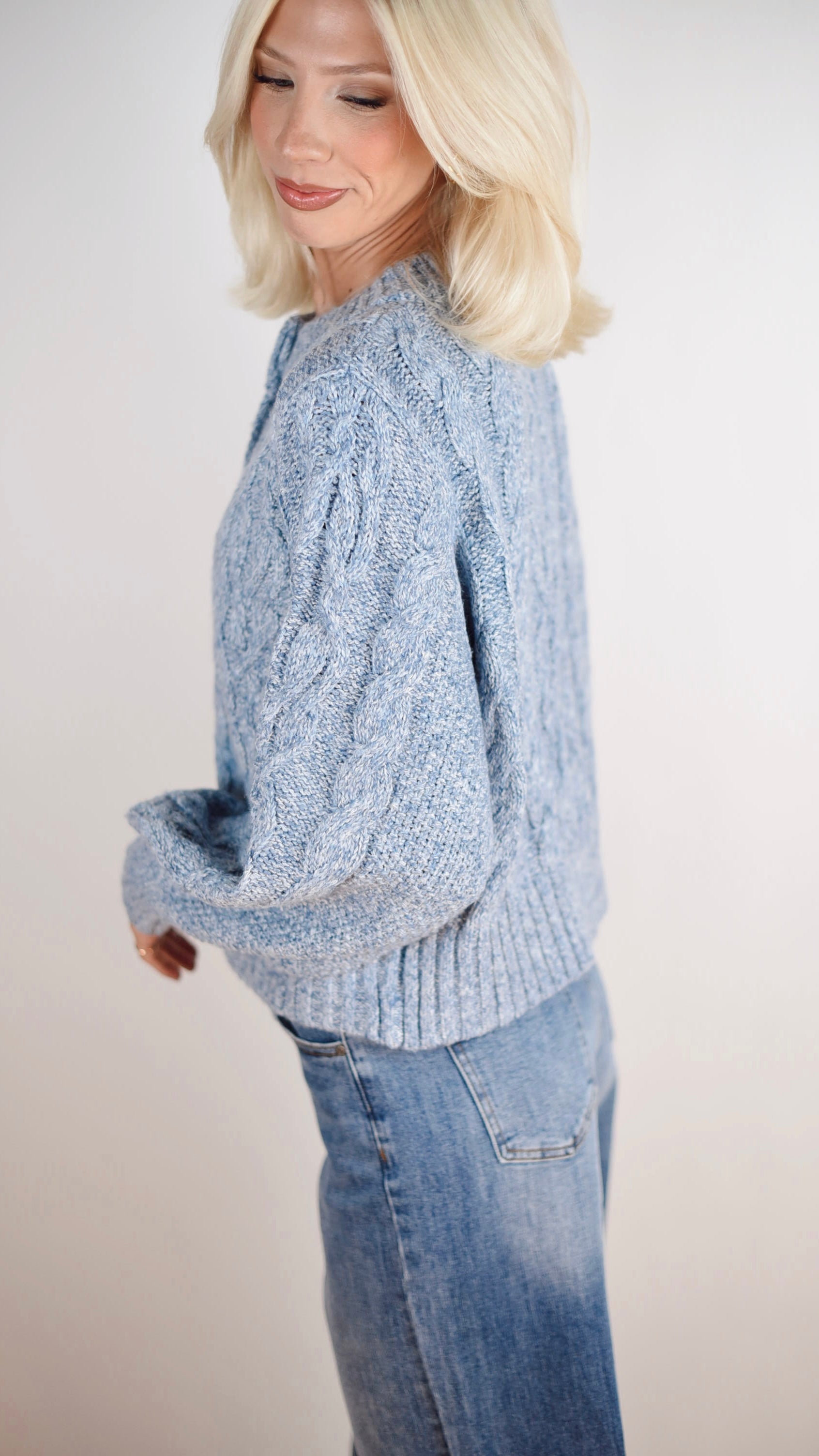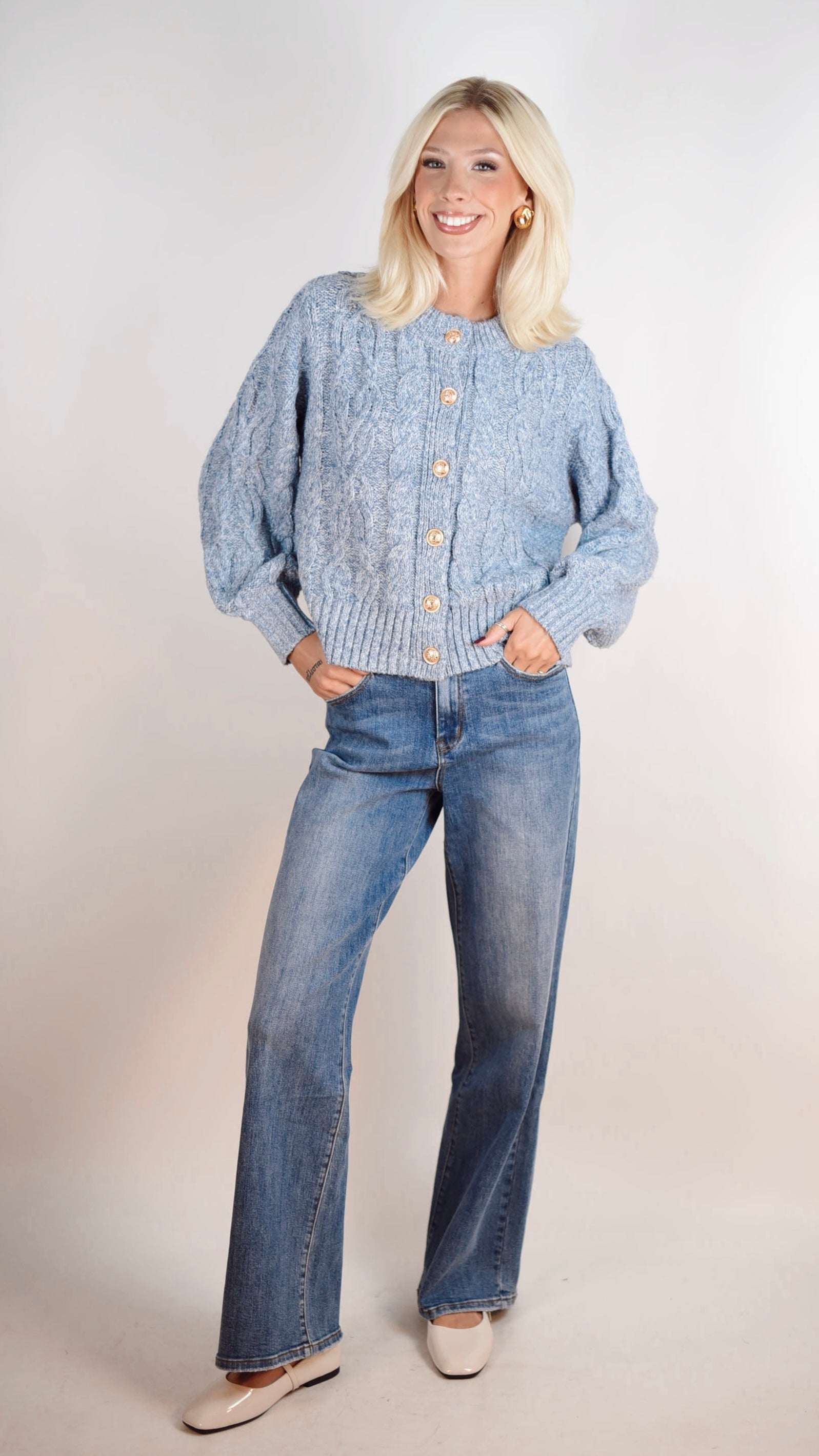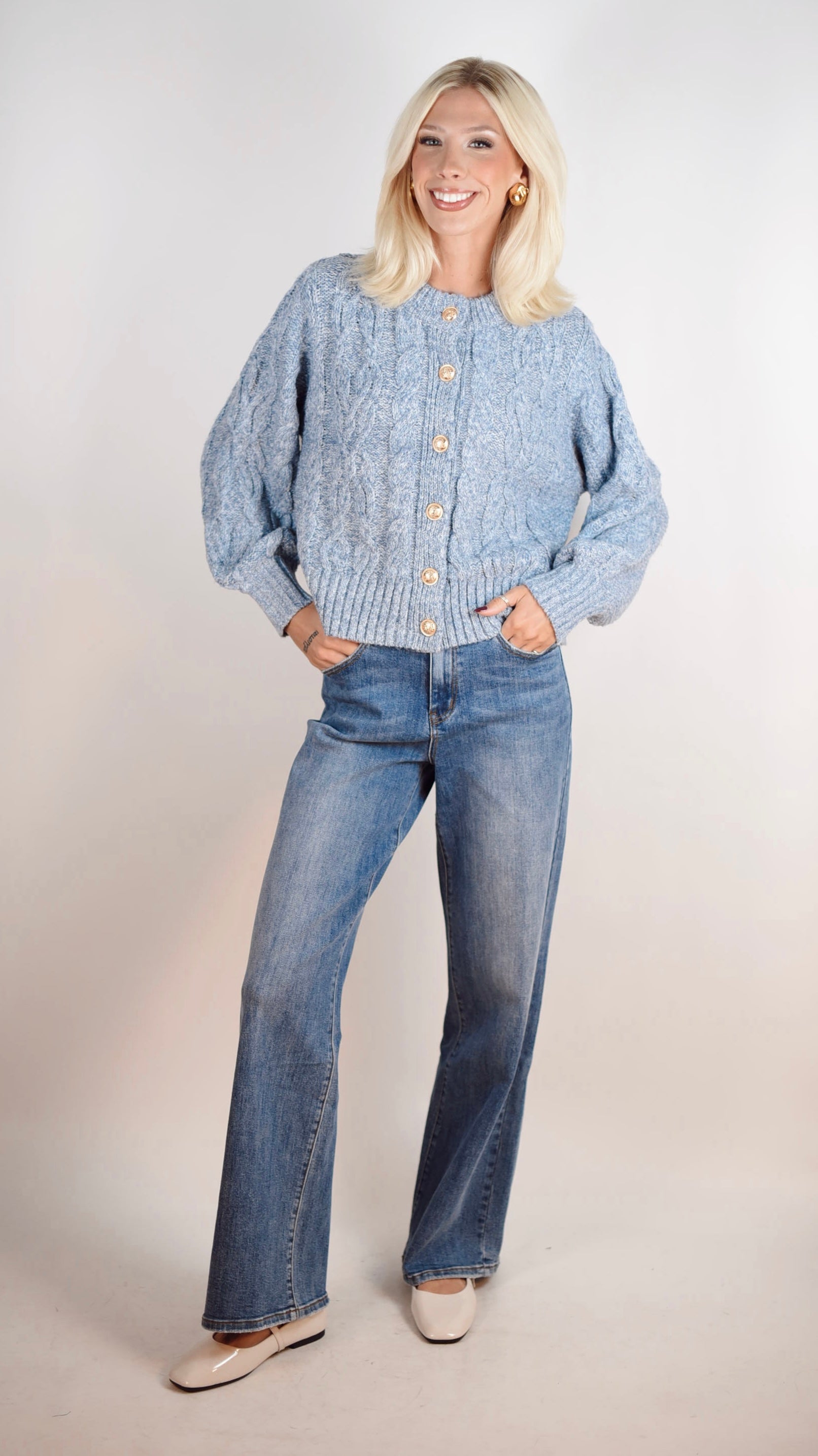 The Sabrina Sweater is a must for this upcoming fall and winter season. The chunky cable-knit is heavy enough to wear alone, or unbutton and throw over a basic as a layering element. The soft gray-blue of this sweater brings a subtle pop of color into your outfit, while allowing the gold buttons to stand out.