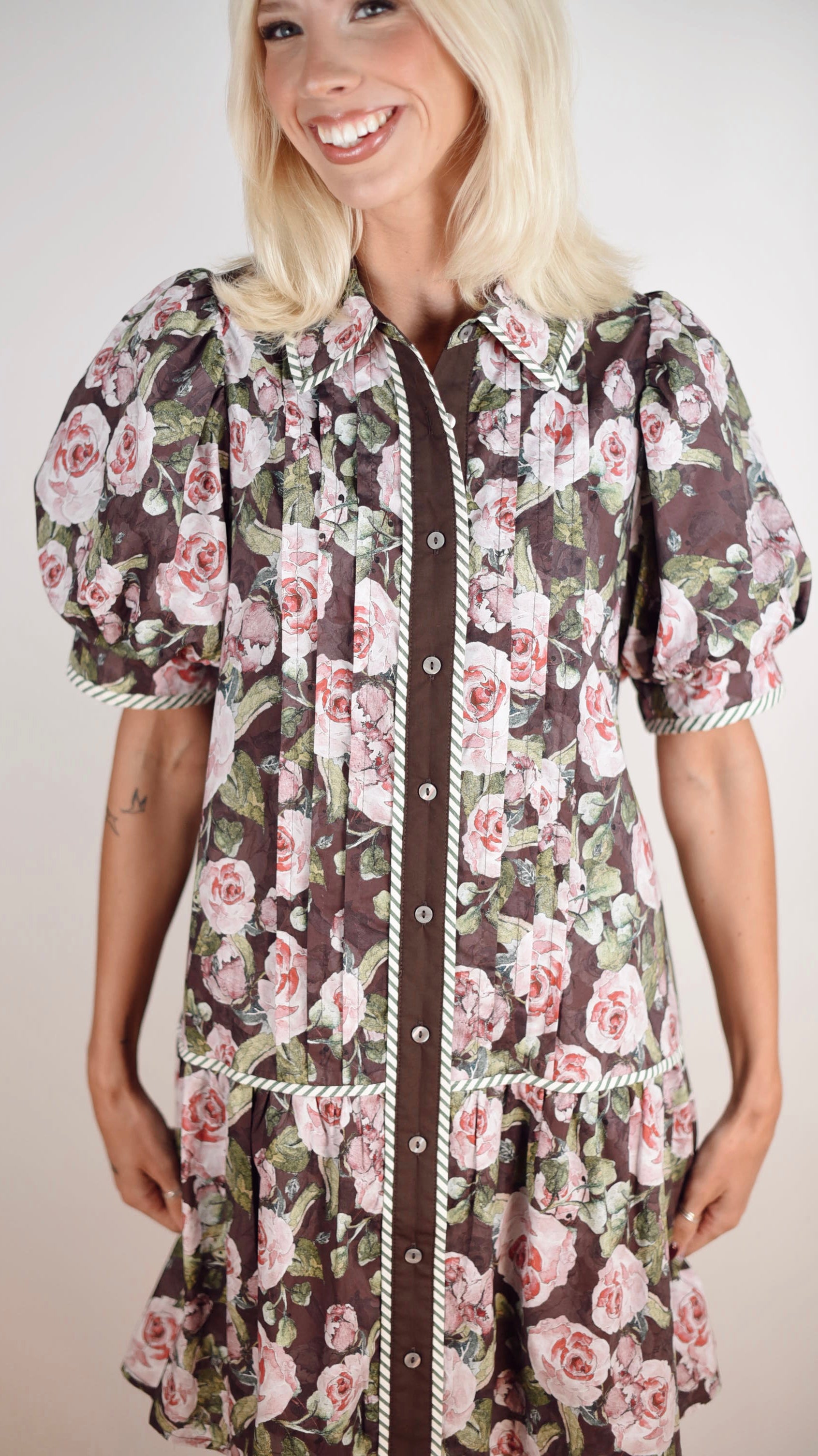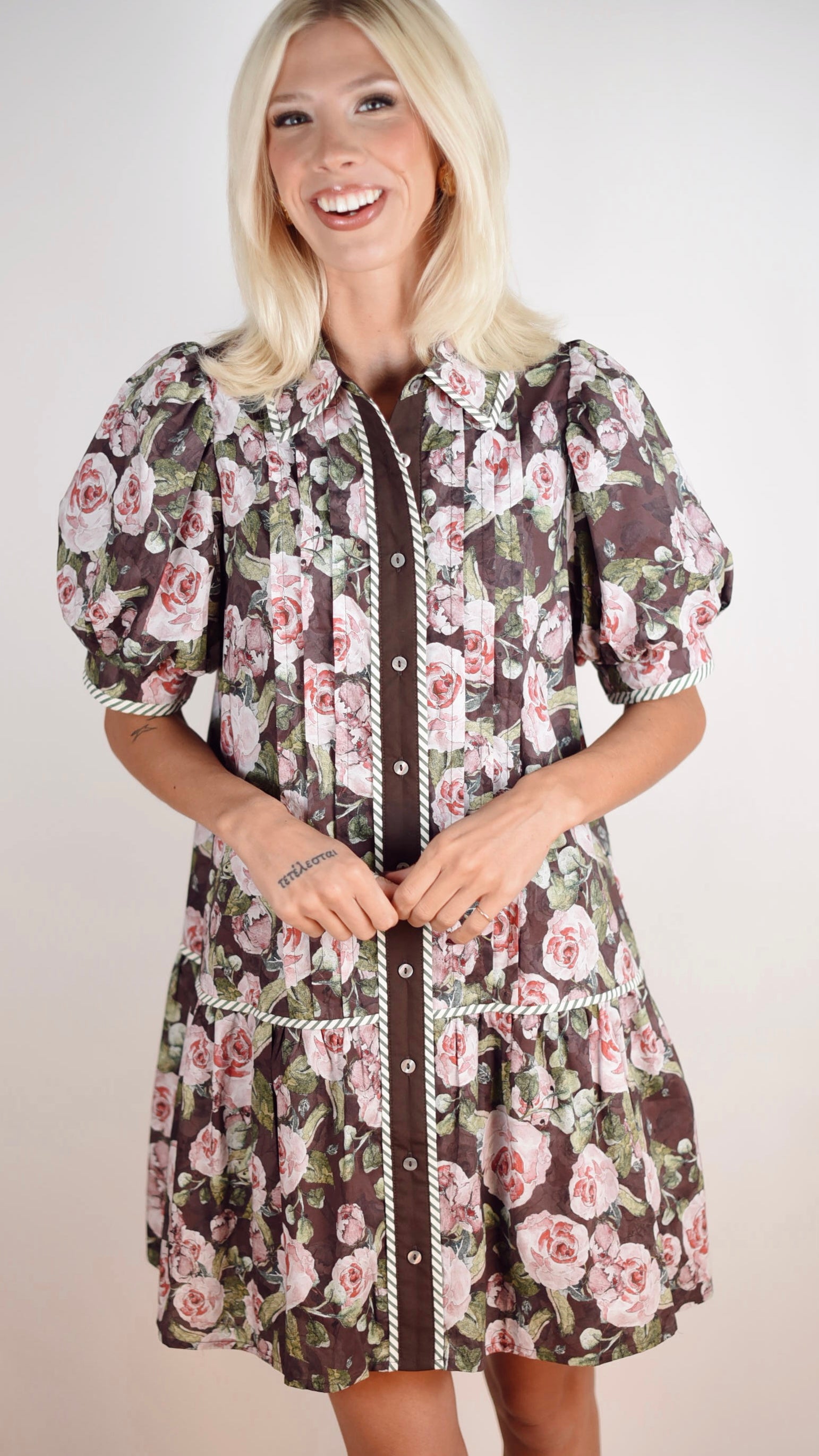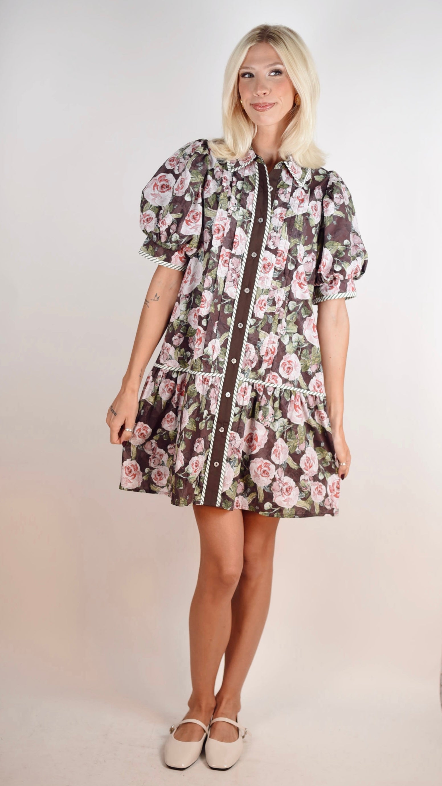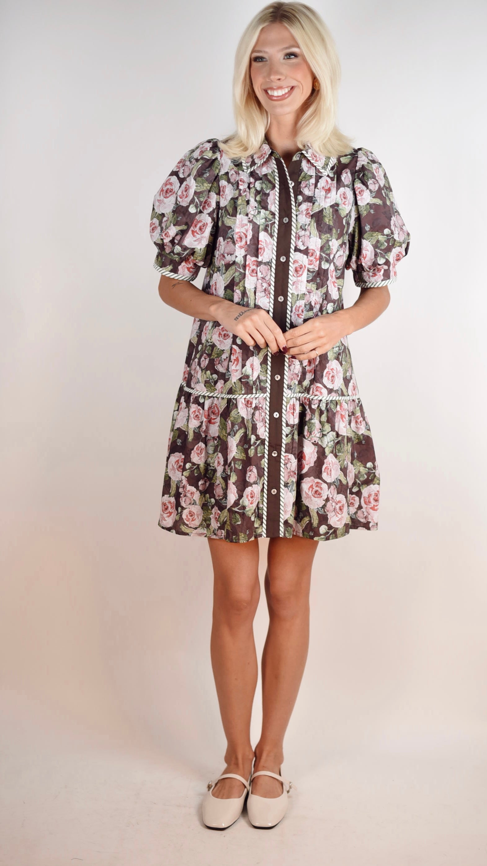 The Luna dress features a warm fall color palette of rich browns, mauves and greens. The watercolor floral pattern brings a fun, girly element to your fall wardrobe. This dress includes a collar and subtle puff sleeve, accented in a green stripe trim. The stripe trim flows down the front buttons of this dress and hits the bottom tier to create a super flattering silhouette. Includes pockets and full inner lining.