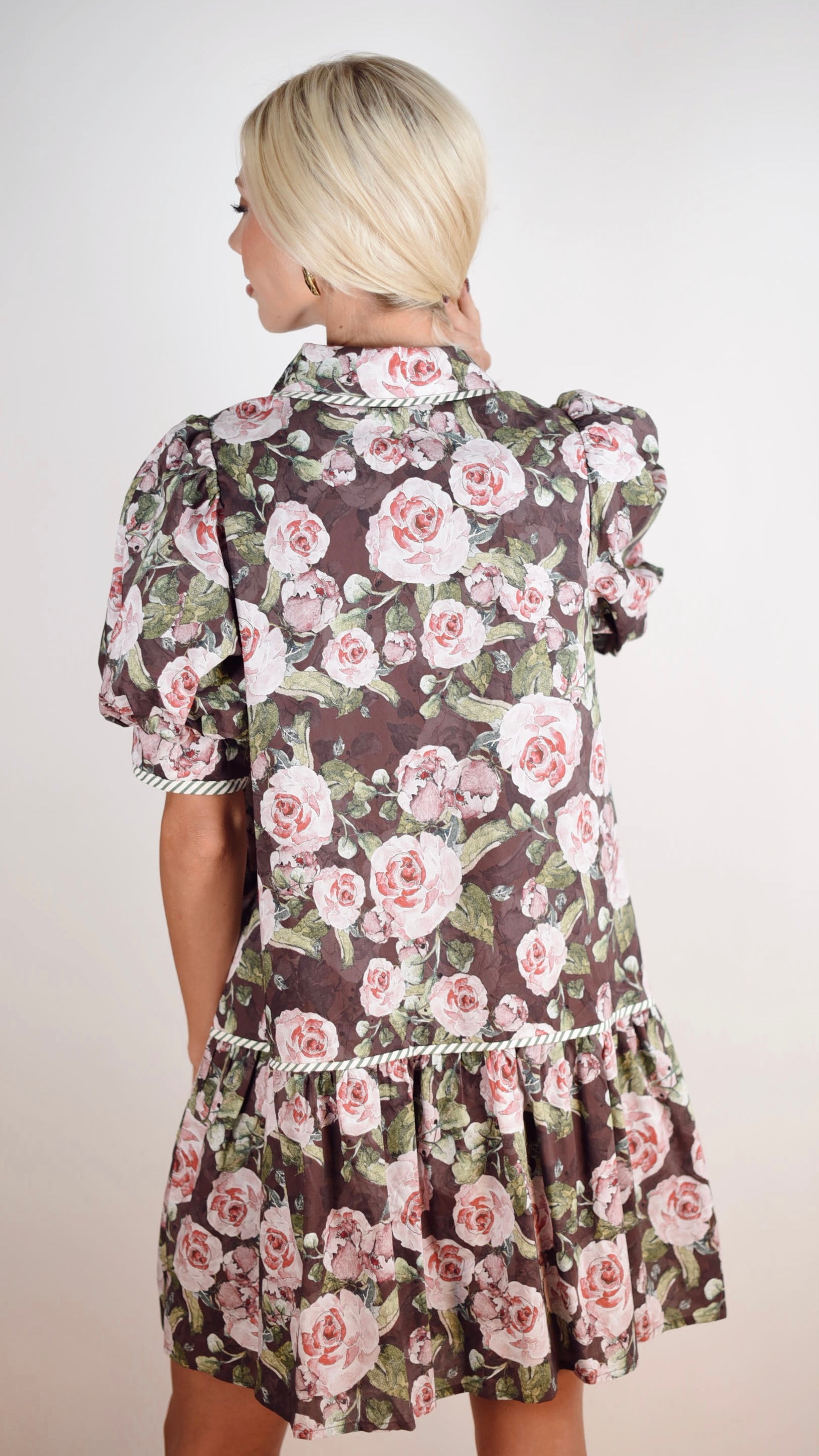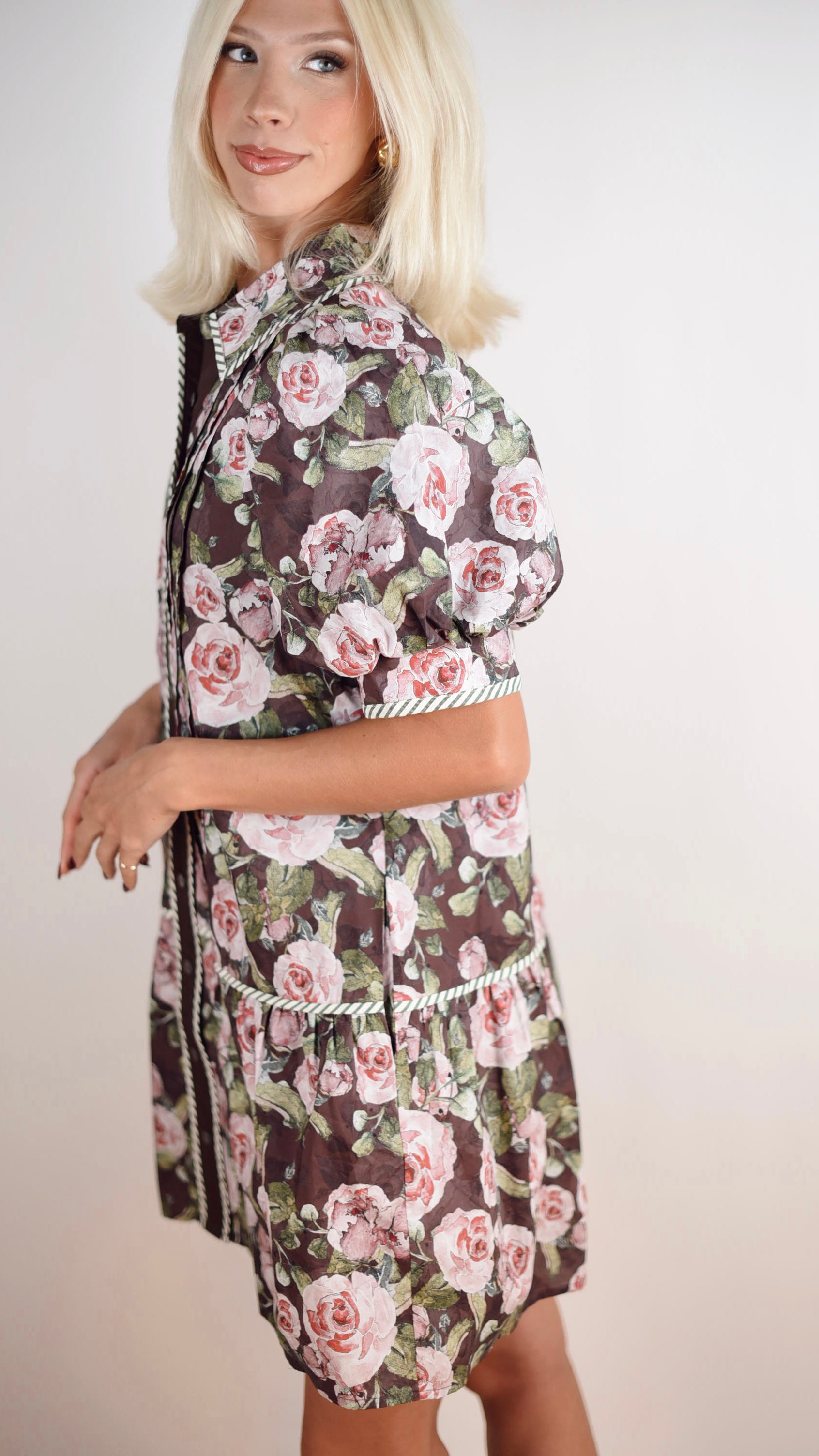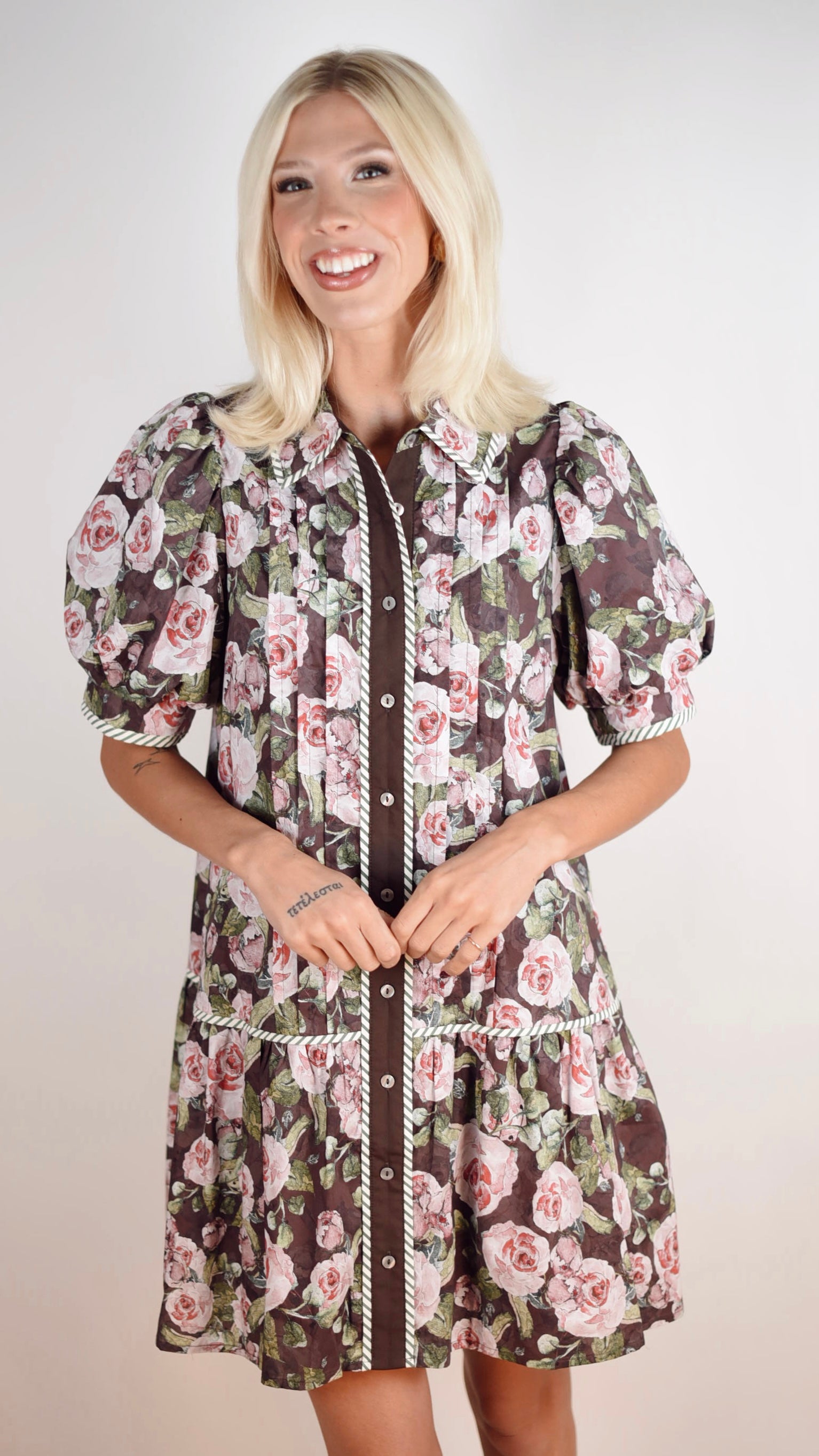 The Luna dress features a warm fall color palette of rich browns, mauves and greens. The watercolor floral pattern brings a fun, girly element to your fall wardrobe. This dress includes a collar and subtle puff sleeve, accented in a green stripe trim. The stripe trim flows down the front buttons of this dress and hits the bottom tier to create a super flattering silhouette. Includes pockets and full inner lining.
