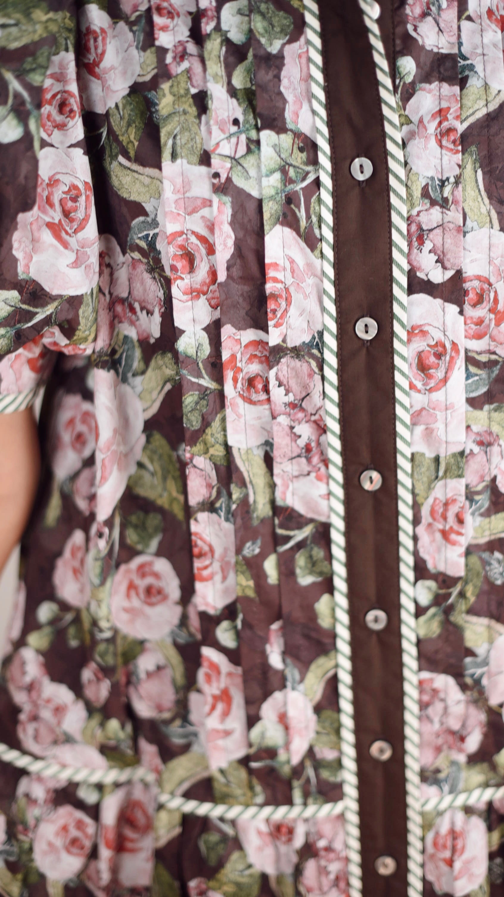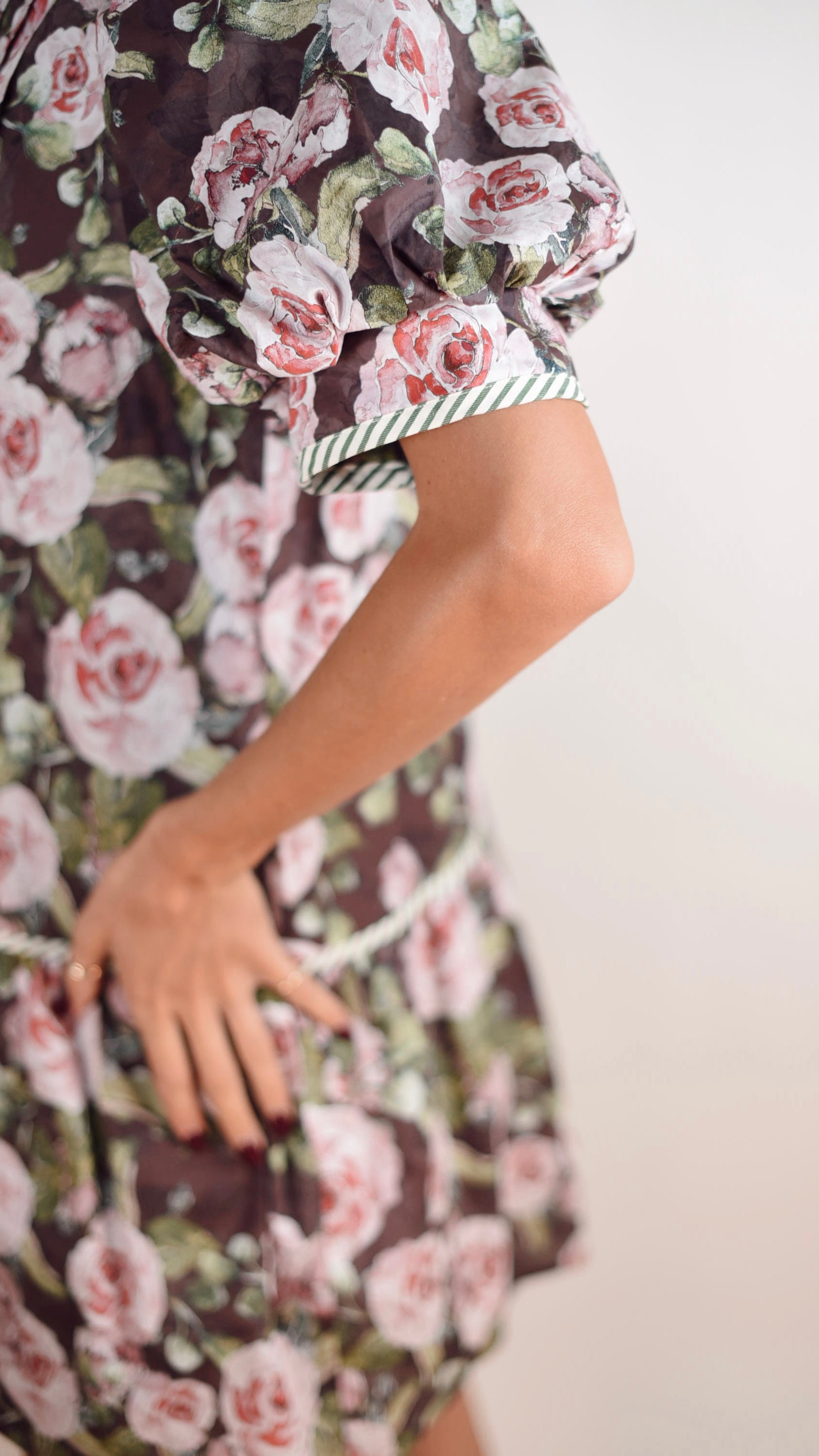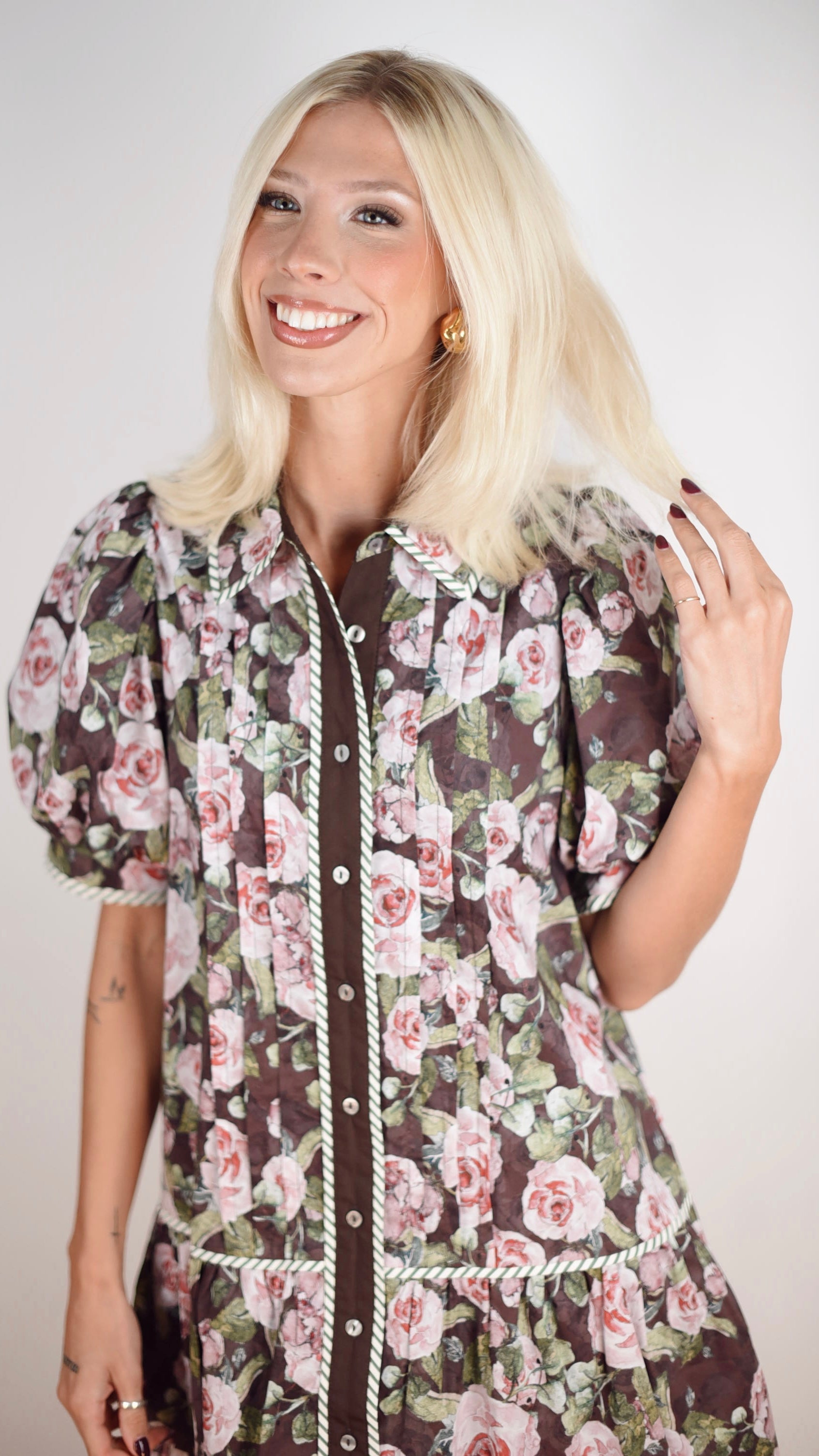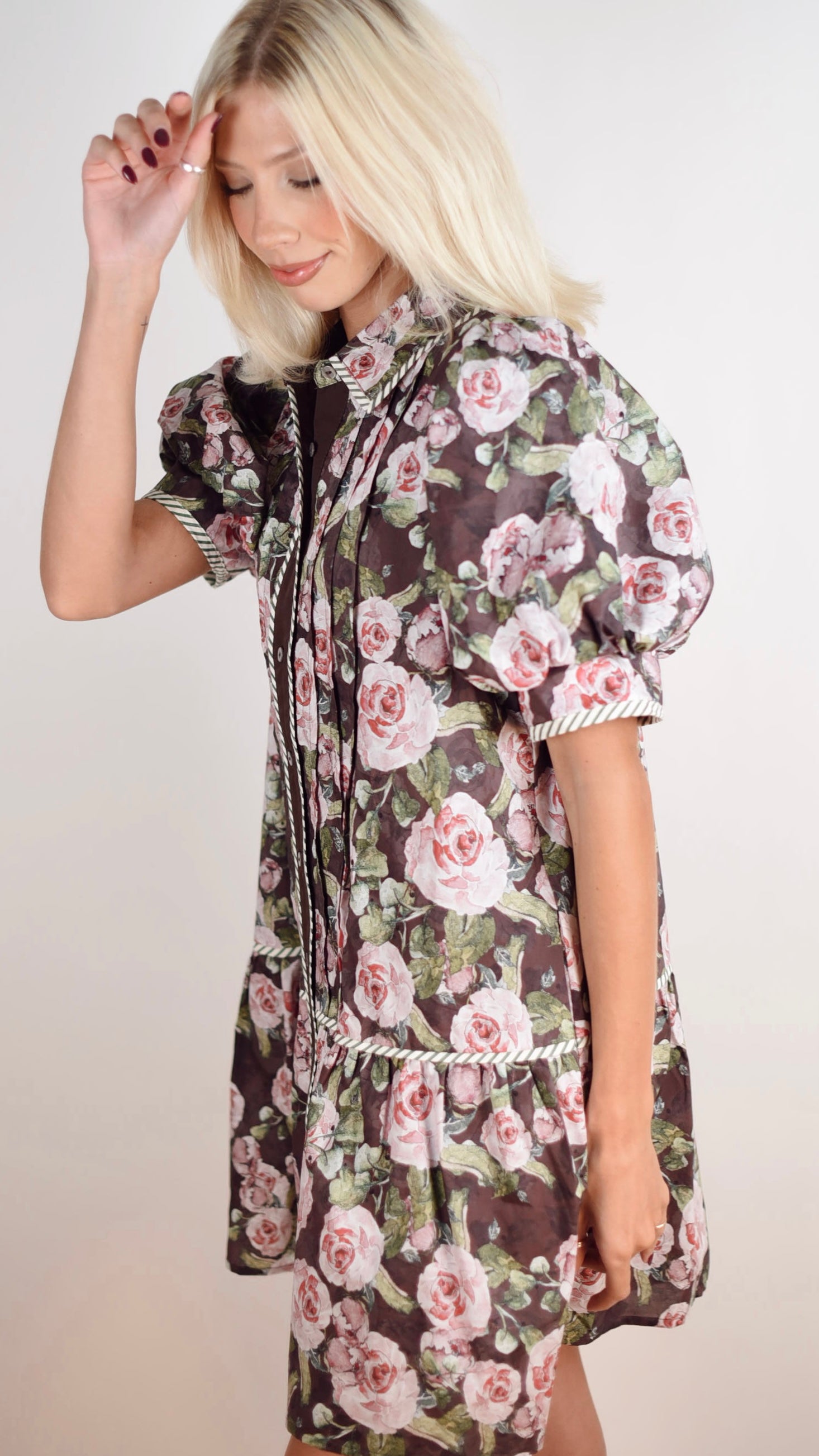 The Luna dress features a warm fall color palette of rich browns, mauves and greens. The watercolor floral pattern brings a fun, girly element to your fall wardrobe. This dress includes a collar and subtle puff sleeve, accented in a green stripe trim. The stripe trim flows down the front buttons of this dress and hits the bottom tier to create a super flattering silhouette. Includes pockets and full inner lining.