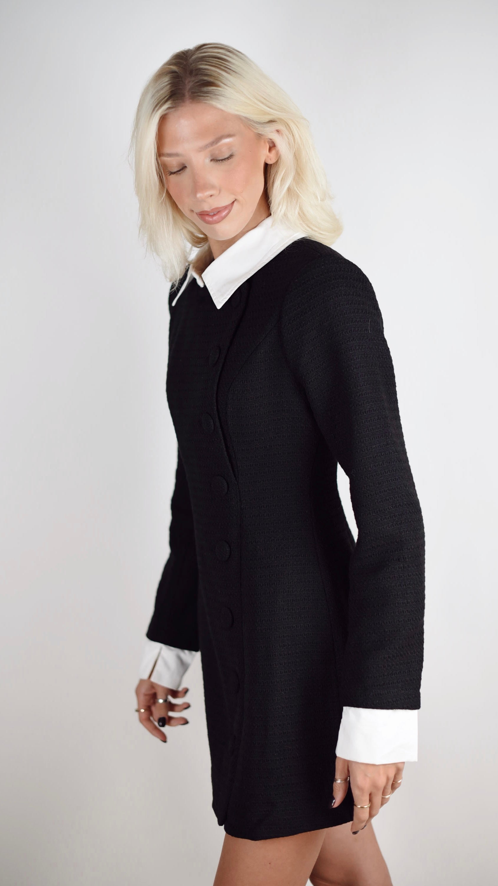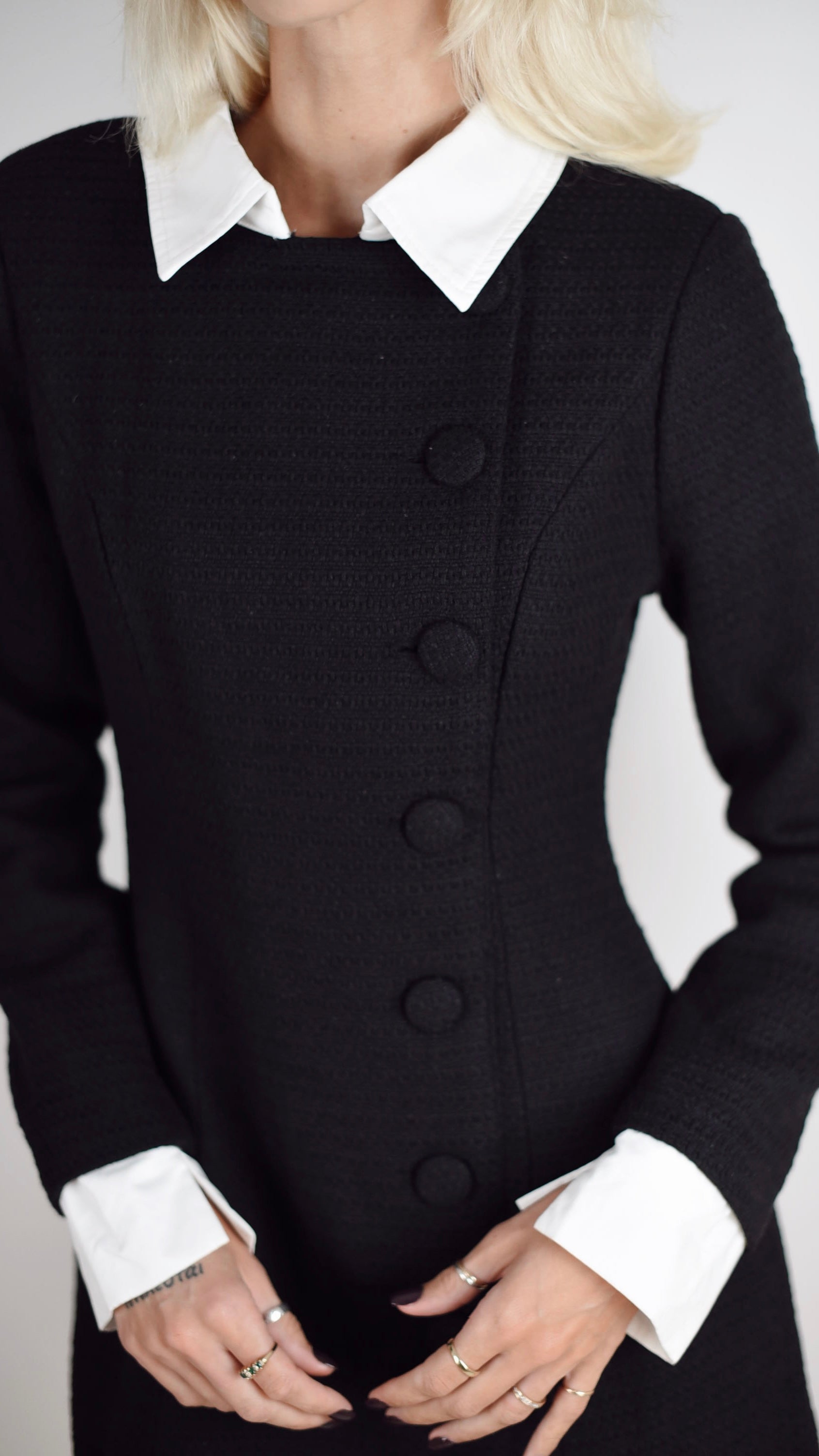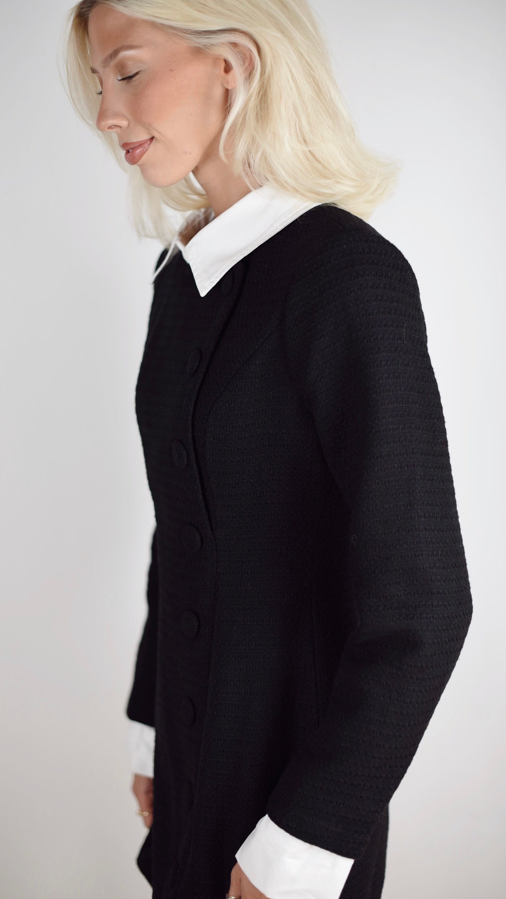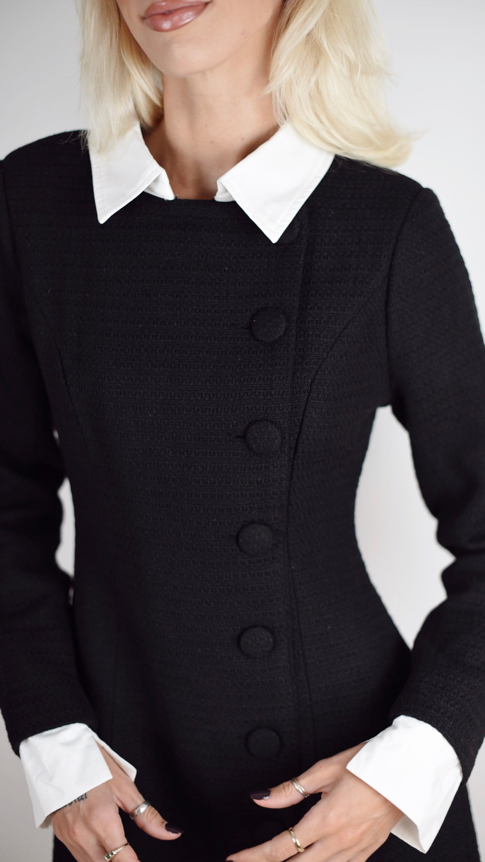 Bring a little drama to your next event in the Blair Dress. From the classic black boucle tweed fabric to the faux blouse collar and cuffs, this dress brings an elegant yet powerful feel to your wardrobe. The large front buttons give this dress a vintage feel (Jackie Kennedy vibes, anyone?), while still staying on trend.