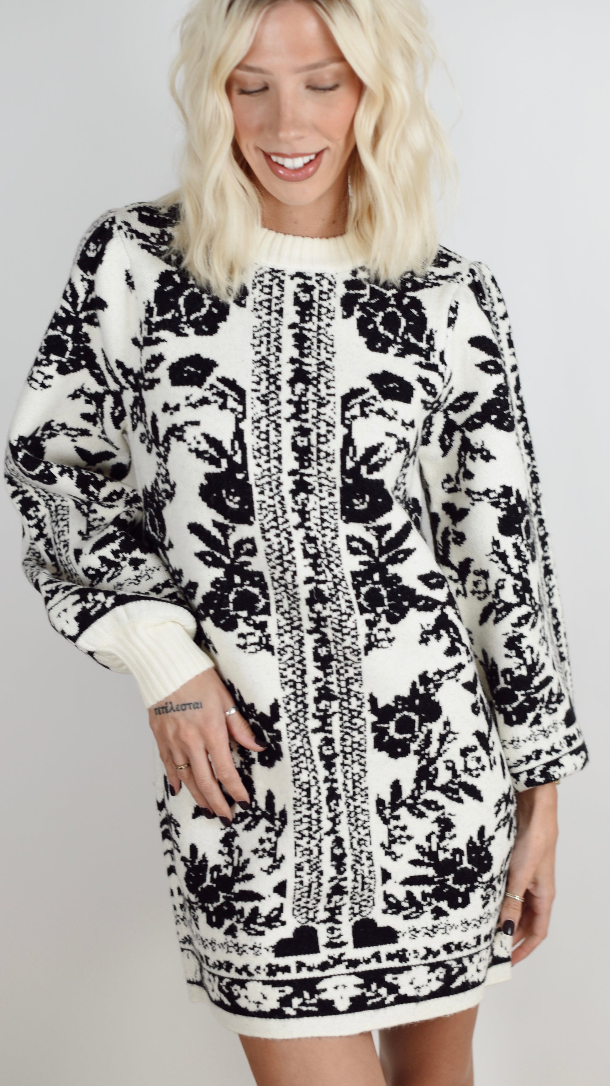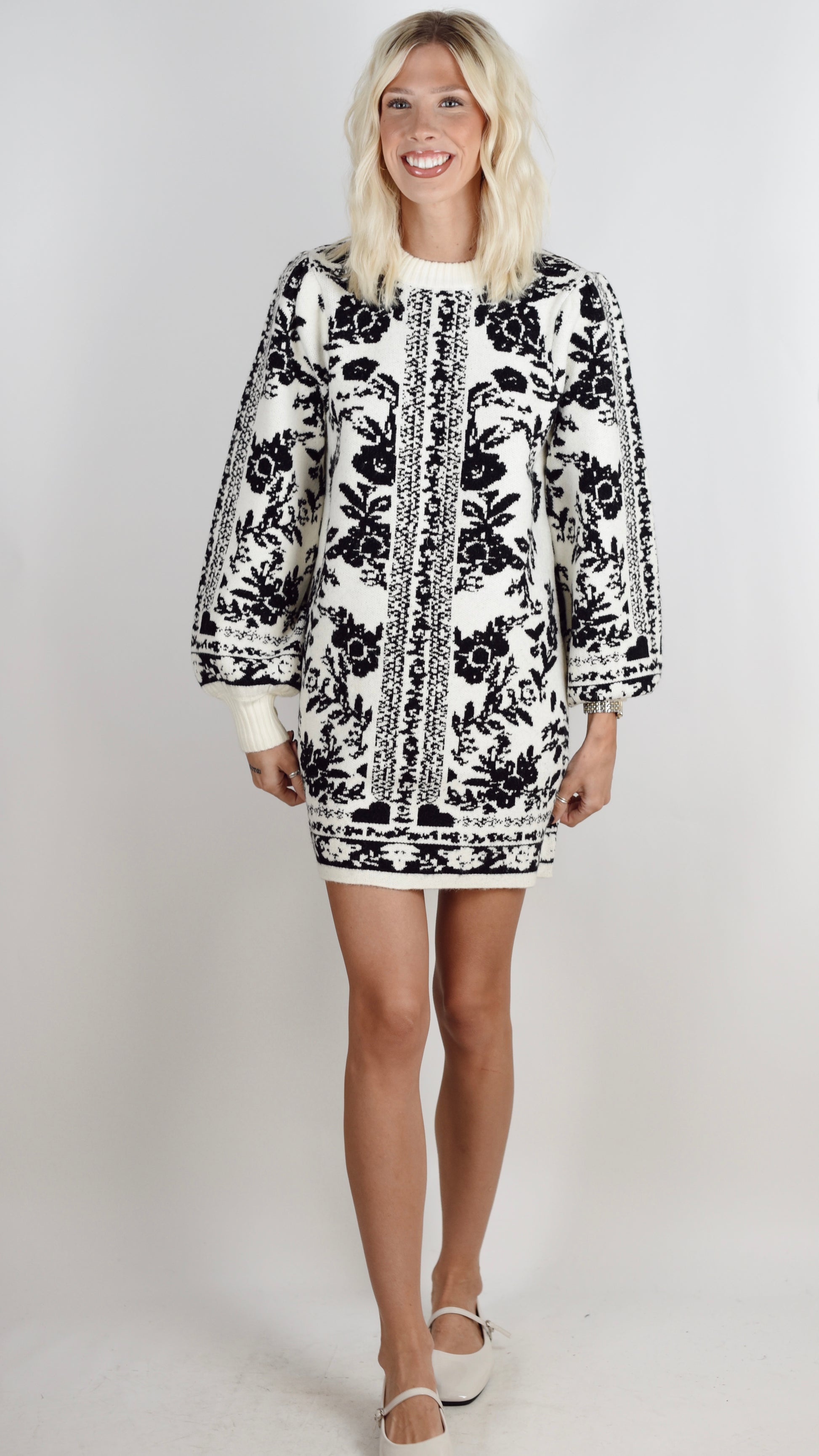 The Alexis Sweater Dress features an elegant black and ivory floral pattern on a buttery soft sweater material. The slight puff sleeve and knit trim detailing brings a flattering shape to elevate even further. Style with your favorite ballet flat or heel for any occasion.