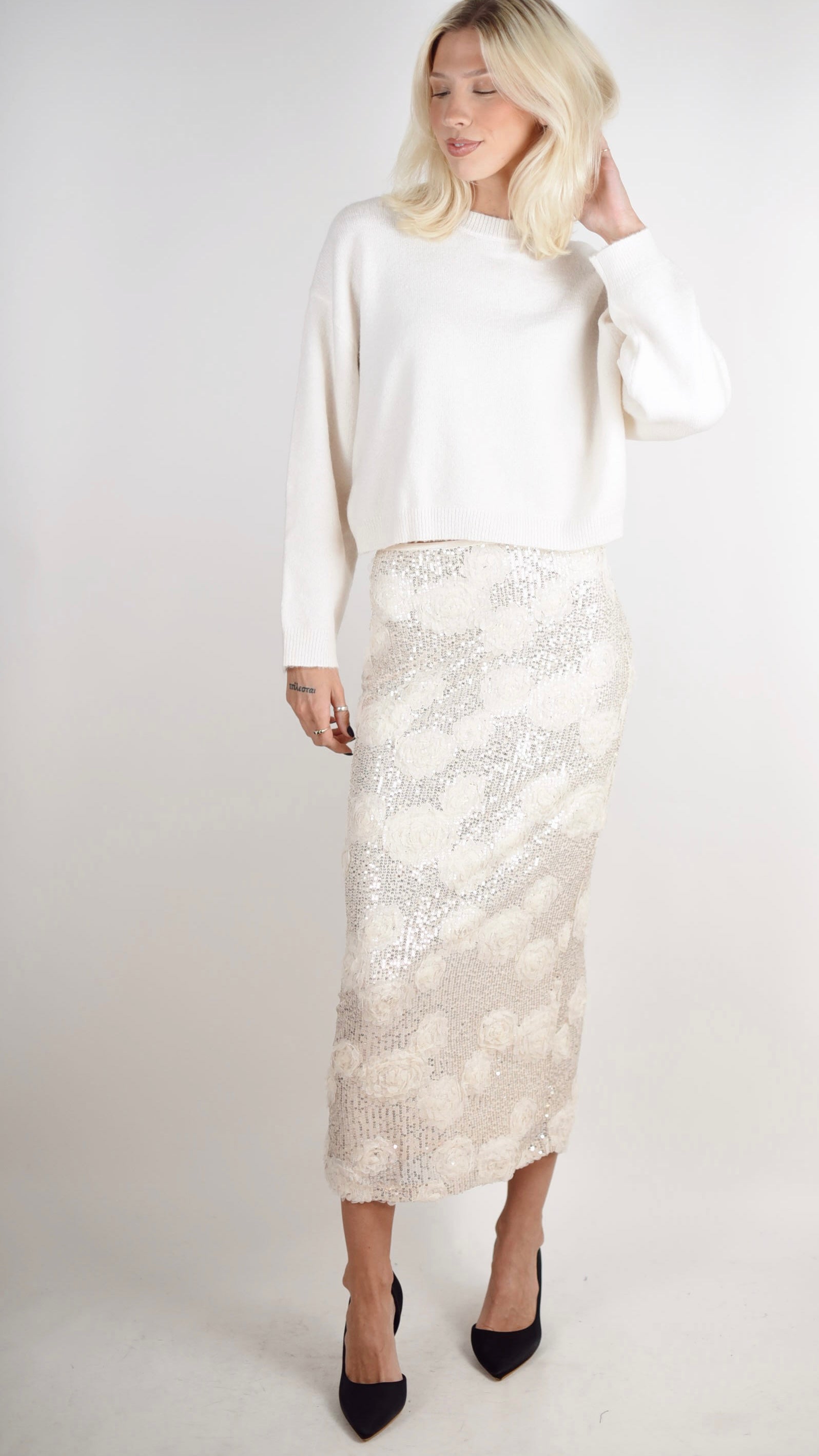 The Jaqueline Skirt is for the gal that loves a sparkle moment, while keeping a neutral and elegant feel. This skirt features a stunning ivory tone and silver sparkle that catches the light so beautifully, while the matching floral ruffles add an extra girly element. This skirt is fully lined and has a great stretch in the body- the waist is true to size with no stretch. Pair with a sweater and a pair of flats for any occasion.