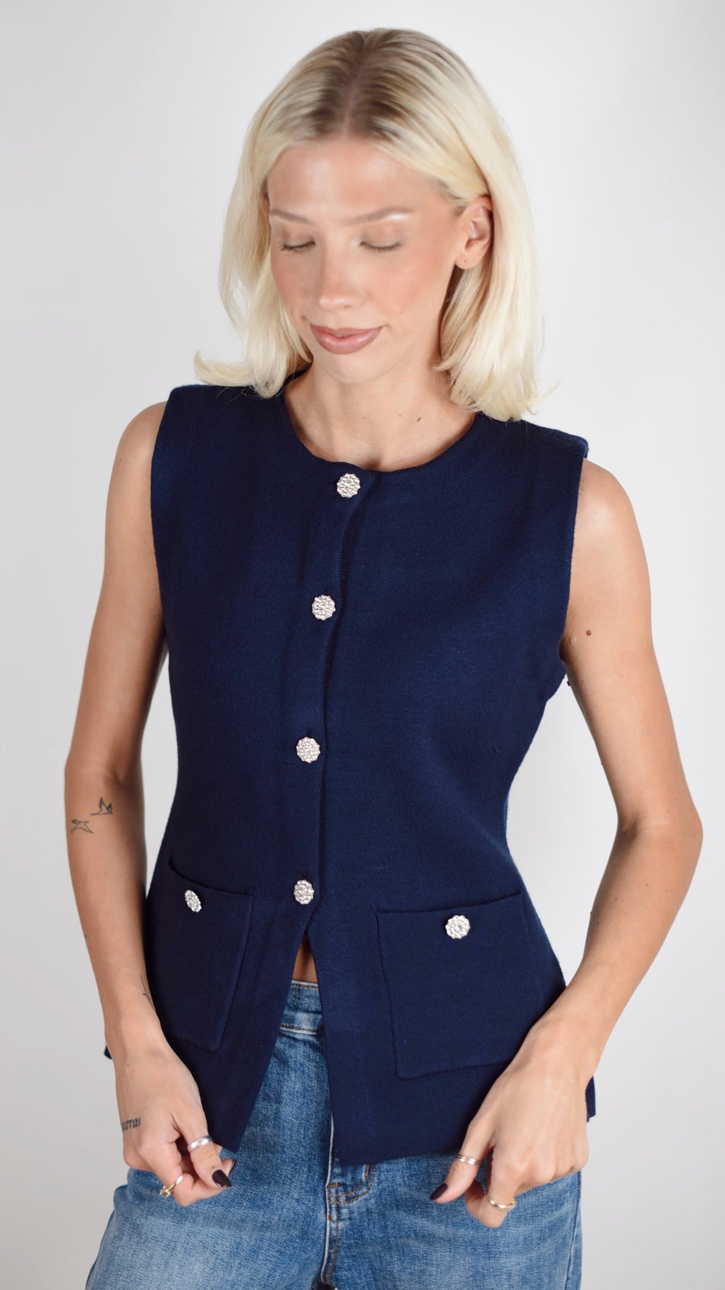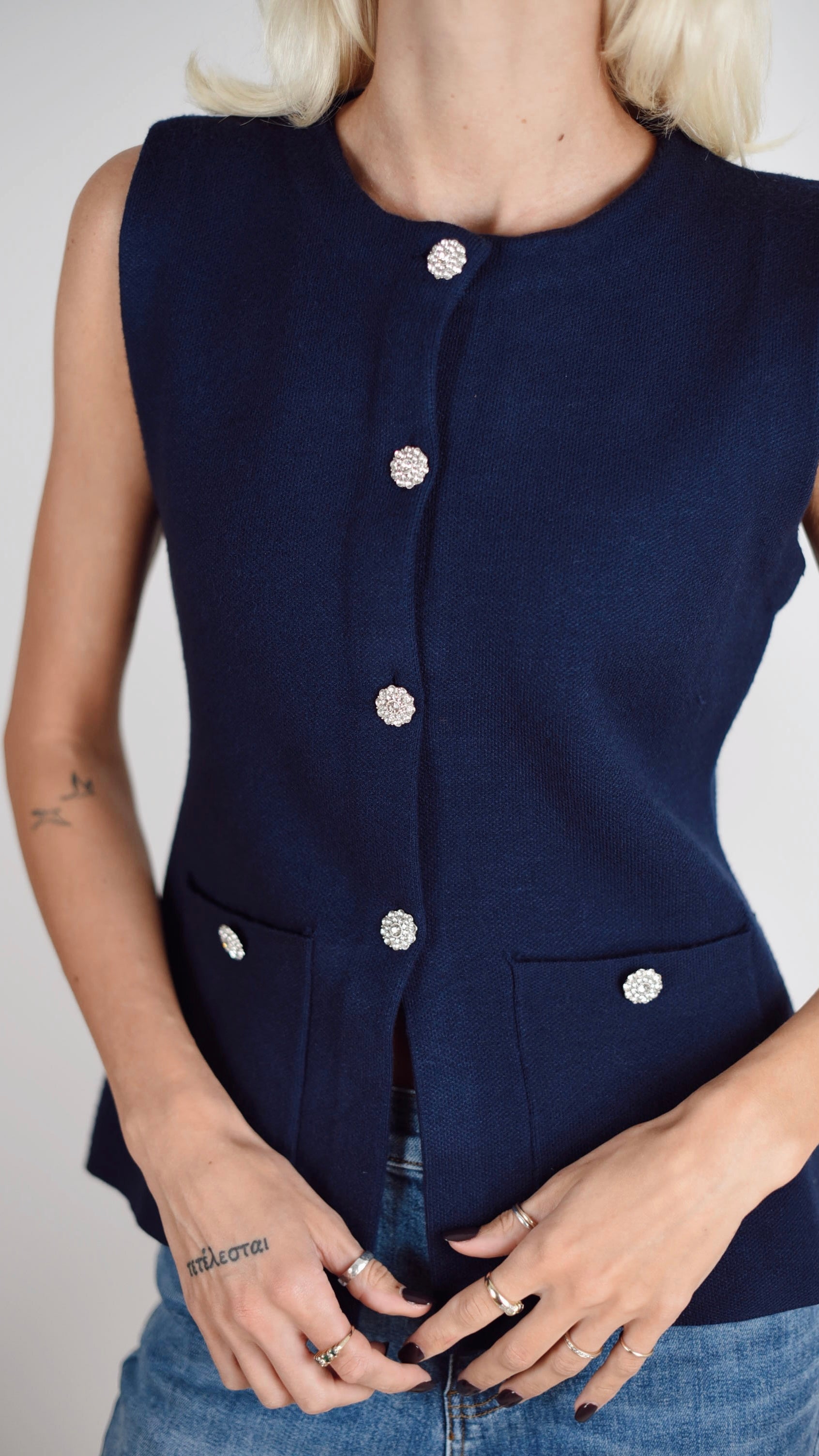 The Cordelia Vest brings an elegant, effortless element to your wardrobe. This sweater vest features a rich navy color, two subtle front pockets, silver diamond buttons, and a great material weight. This vest is easy to style alone, or may be layered with a long sleeve underneath as the cooler weather rolls in.