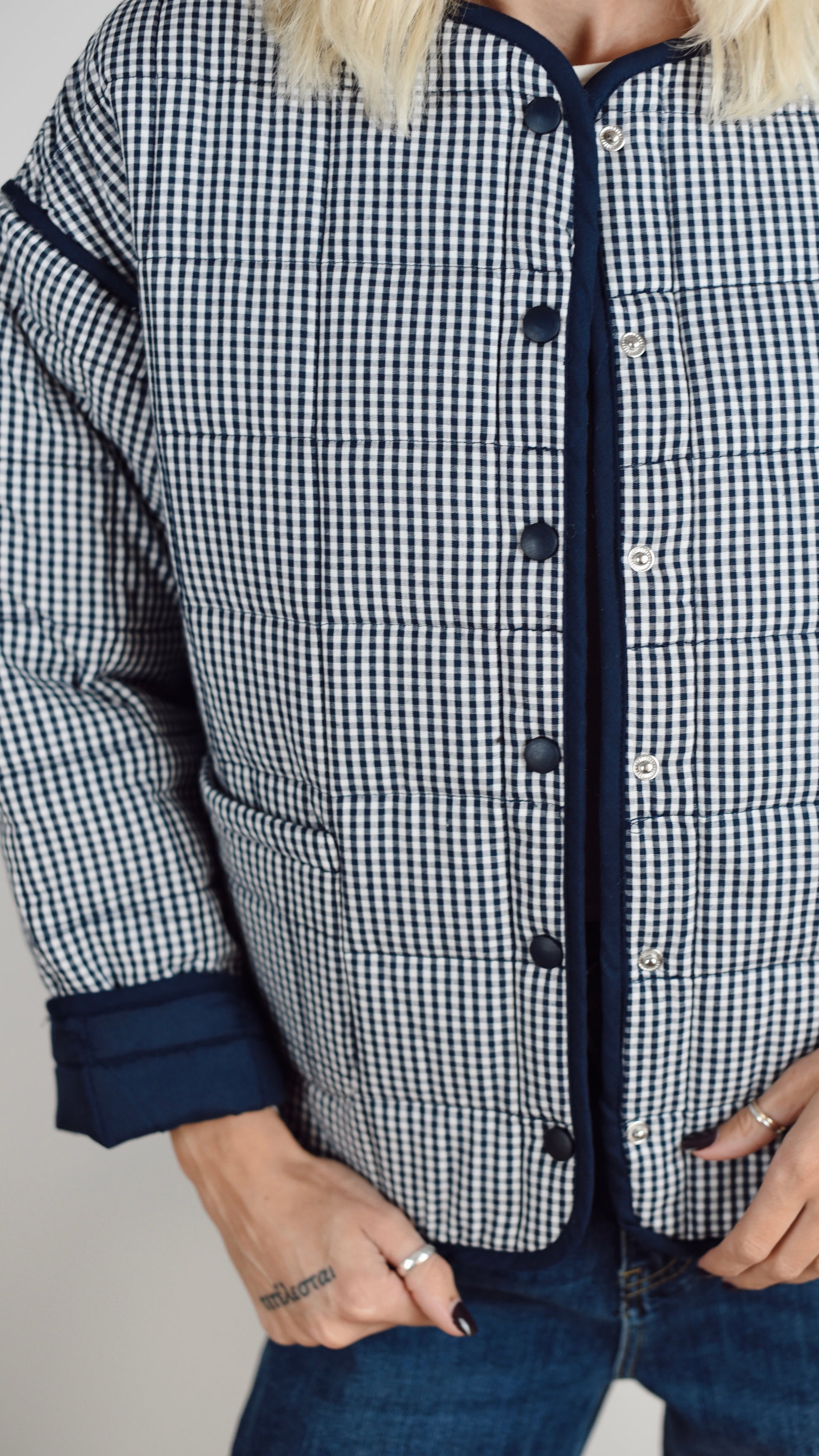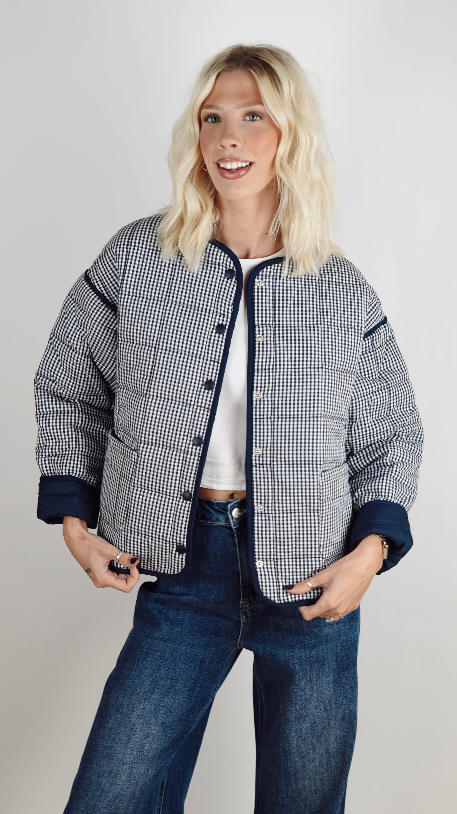 Say hello to the most charming quilted jacket, our Martha Jacket. Featuring a rich navy and white plaid pattern and a full front button, this jacket keeps a timeless and chic feel. This jacket is made from an ultra soft and lightweight cotton fabric, keeping you warm while still being the perfect layering element.
