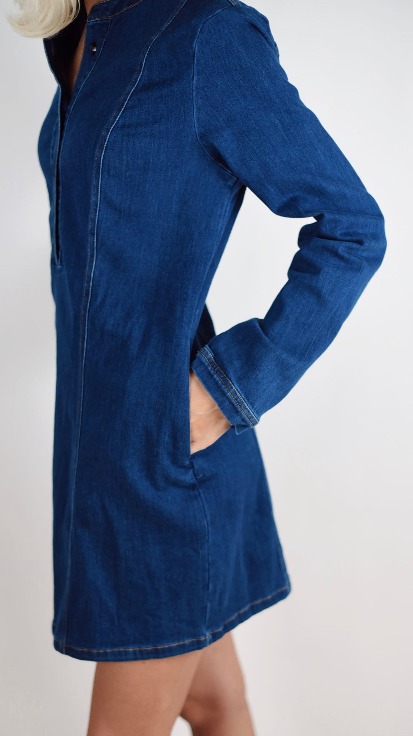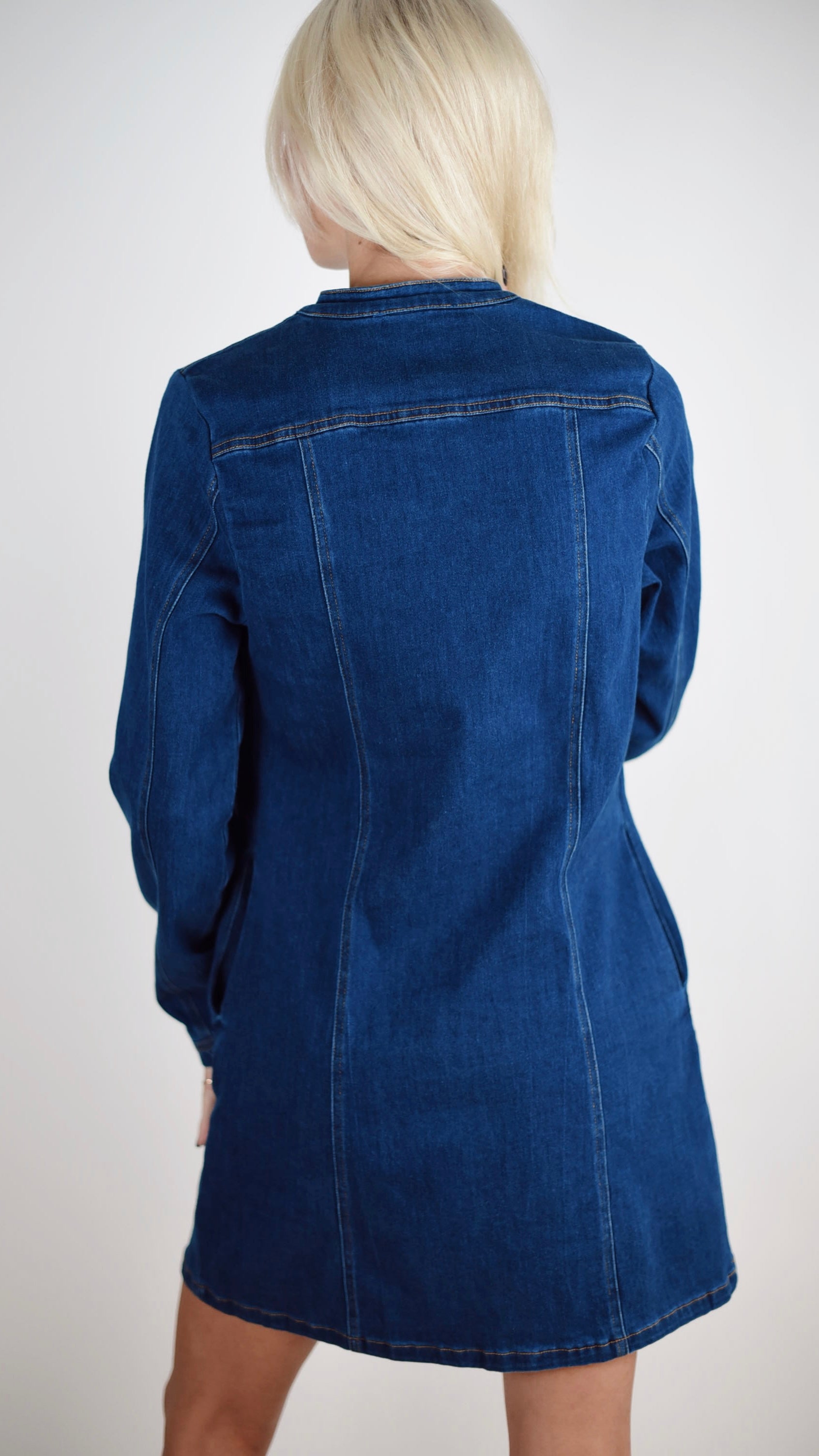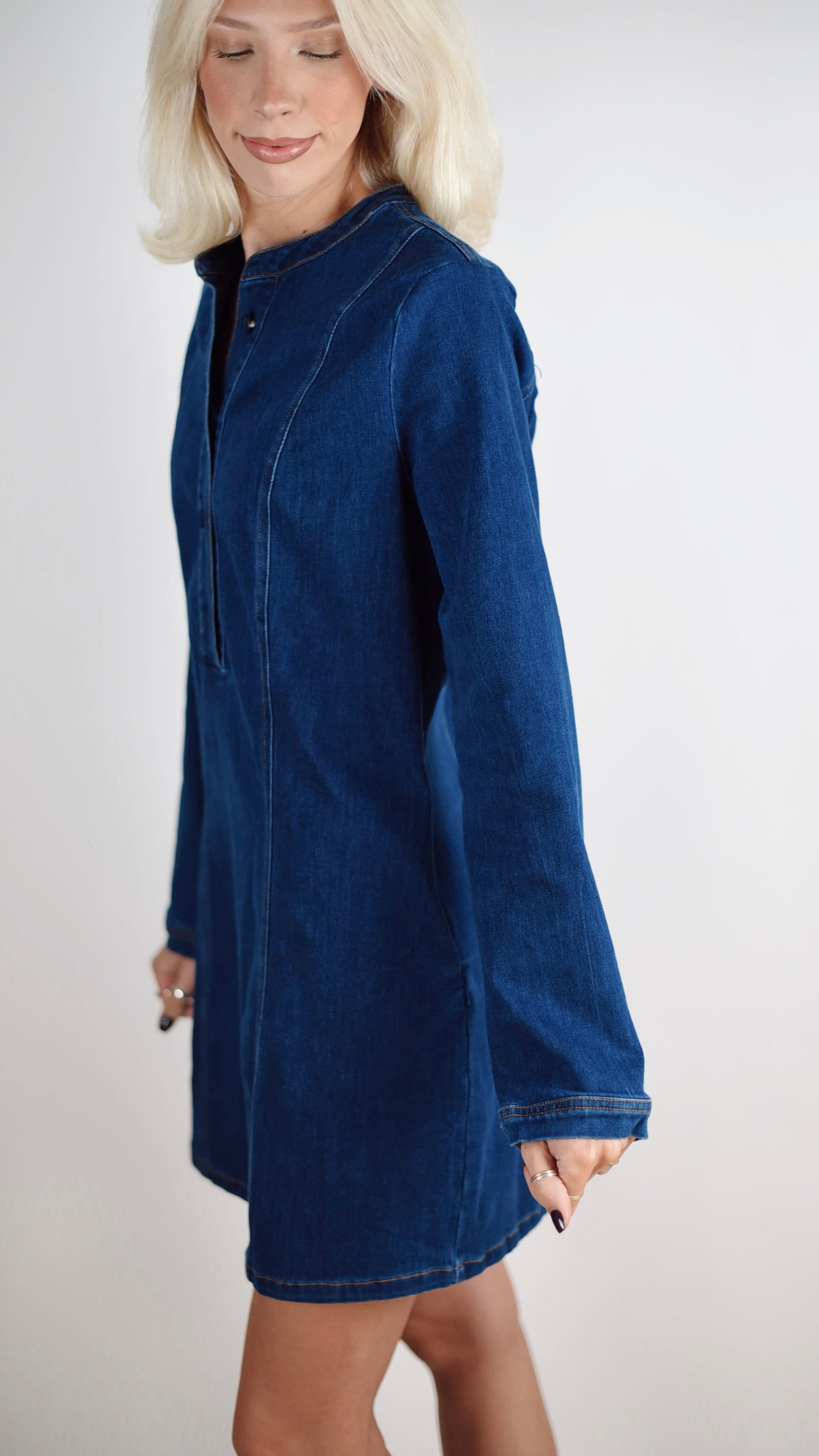 The Victoria Dress is an iconic denim-style dress that is perfect for game-days, concerts, or any fun fall outing. Featuring a quarter front button, long sleeves, and flattering front seam detail, this dress keeps things simple and chic. Throw on with your favorite flats and ball hat for a casual feel, or dress up with a heel and clutch for a perfect date night look.